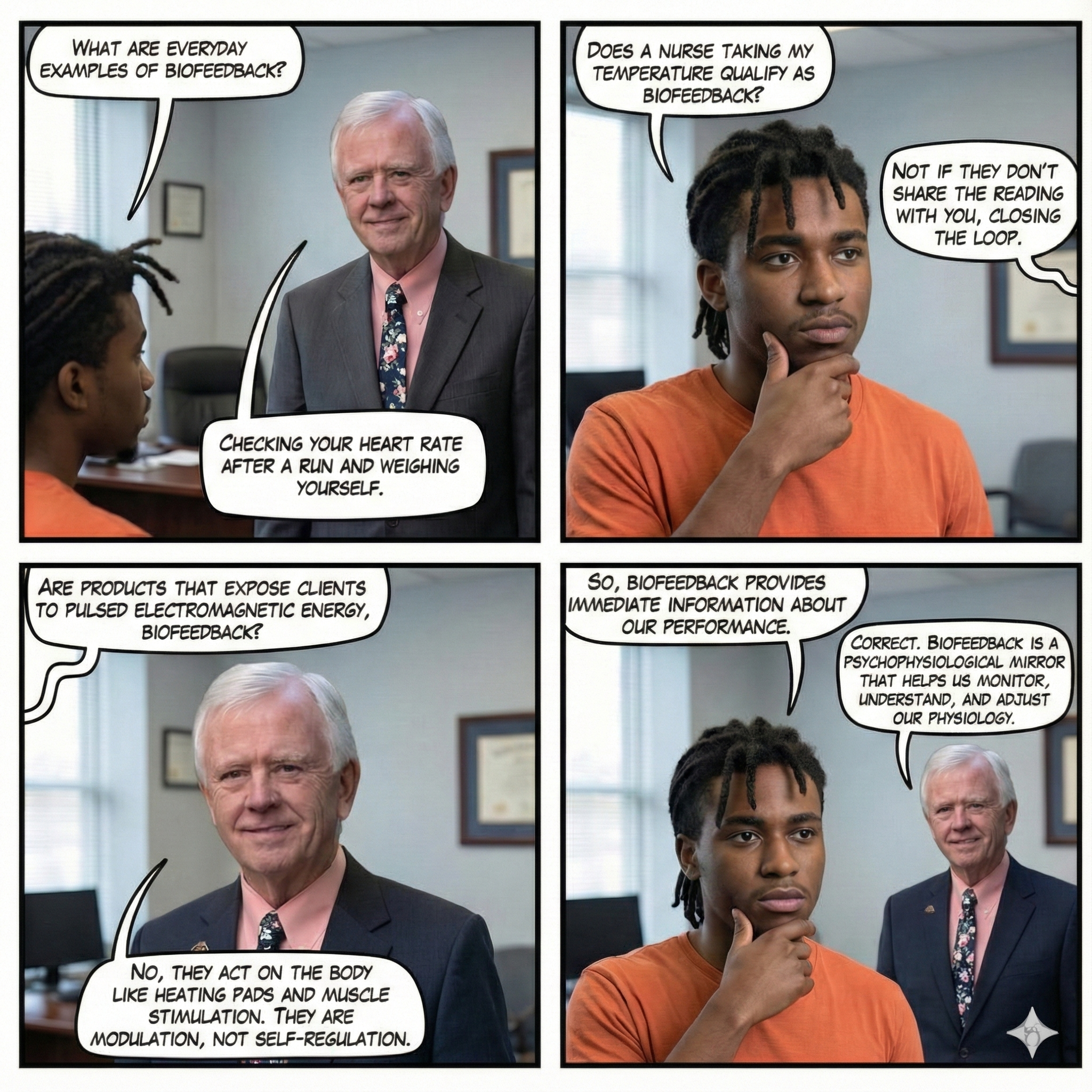 This is perhaps the most important insight of this chapter: biofeedback is defined by the learning process, not by specific equipment. Training can involve sophisticated computerized systems, simple handheld devices, or no technology at all. What matters is the cycle of action, feedback, and adjustment that leads to self-regulation.