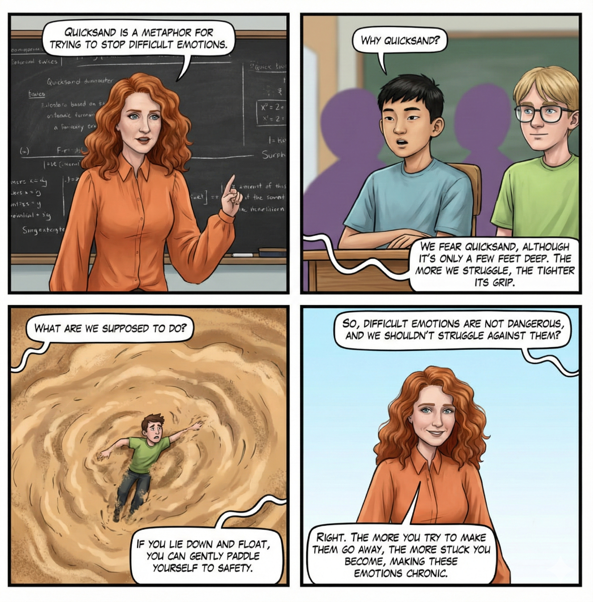Dr. Inna Khazan (2019) uses a vivid metaphor to explain this principle: quicksand. If you have ever seen a movie where someone steps into quicksand, you know that thrashing around makes you sink faster. The counterintuitive solution is to relax, spread your weight, and move slowly. Emotions work similarly. When you desperately fight against anxiety or pain, you often intensify those very experiences. Accepting uncomfortable sensations while taking constructive action (like practicing slow breathing) tends to work better than direct combat.