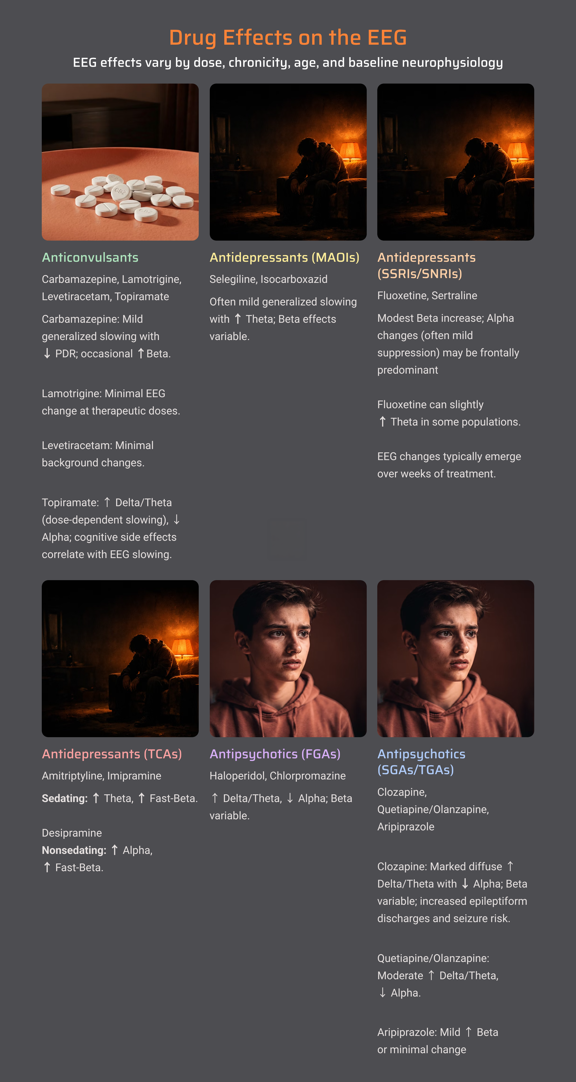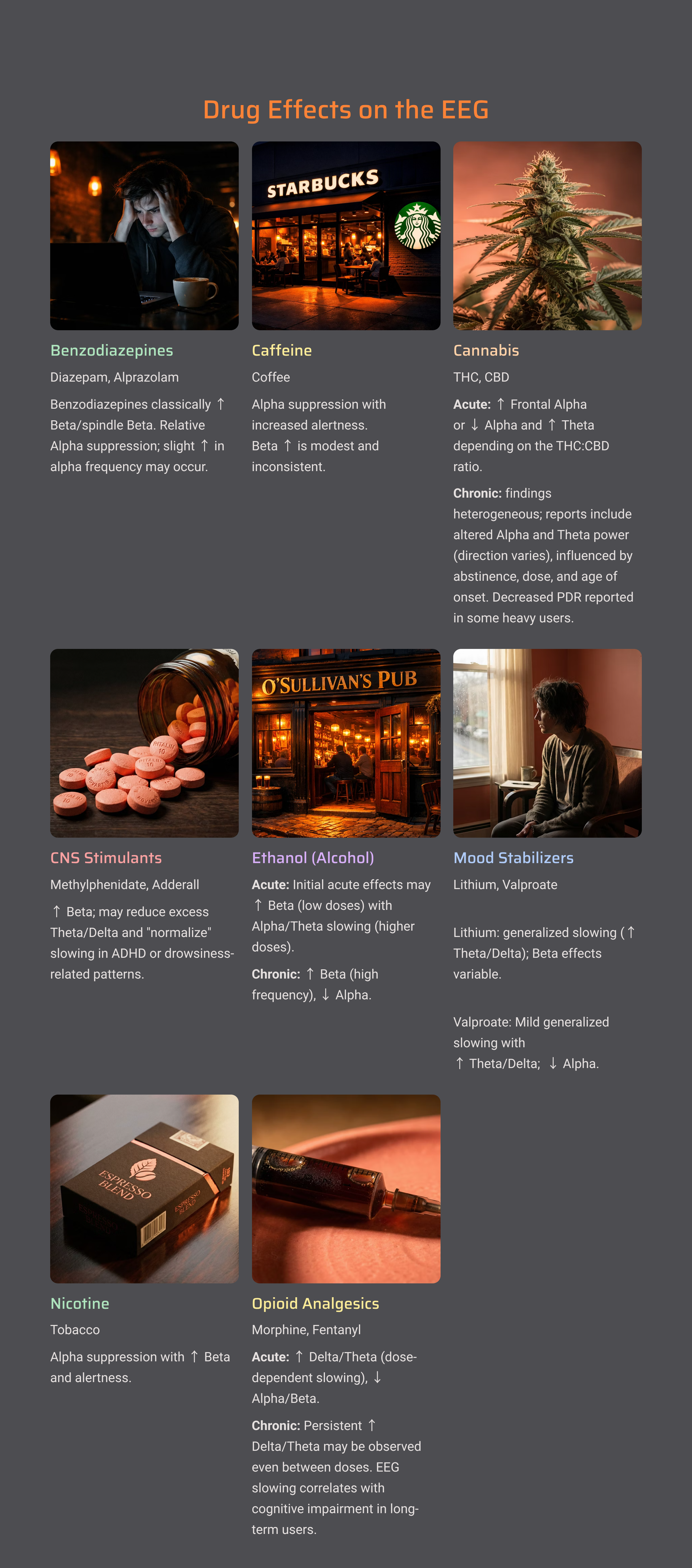 As a general rule, sedating substances (benzodiazepines, alcohol, opioids) tend to increase slow activity and may produce characteristic fast activity called beta spindles. Stimulants often increase fast activity and may reduce slower rhythms. Anticonvulsants have varied effects depending on the specific medication.
