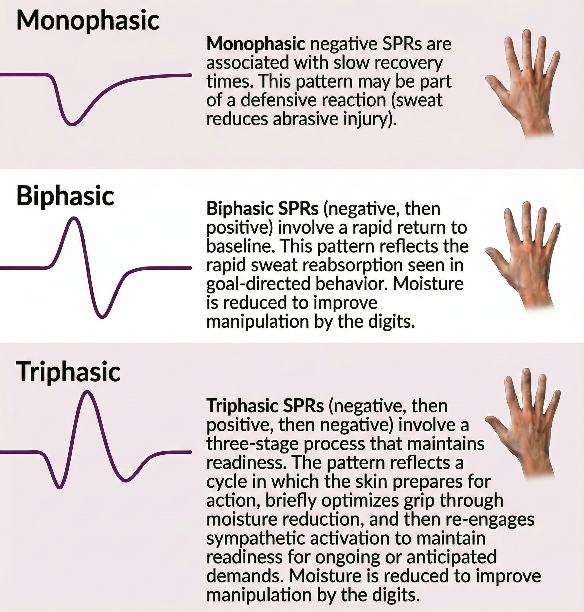 The amplitudes of palmar SCRs and SPRs are highly correlated during a single recording session (Wilcott, 1967). The SPR can exhibit a monophasic waveform (negative or positive), biphasic waveform (negative, then positive), or triphasic waveform (negative, positive, then negative). The classic pattern is biphasic, as shown in the diagram below adapted from Stern, Ray, and Davis (1980). A negative voltage is recorded upward by convention (Stern, Ray, & Quigley, 2001).