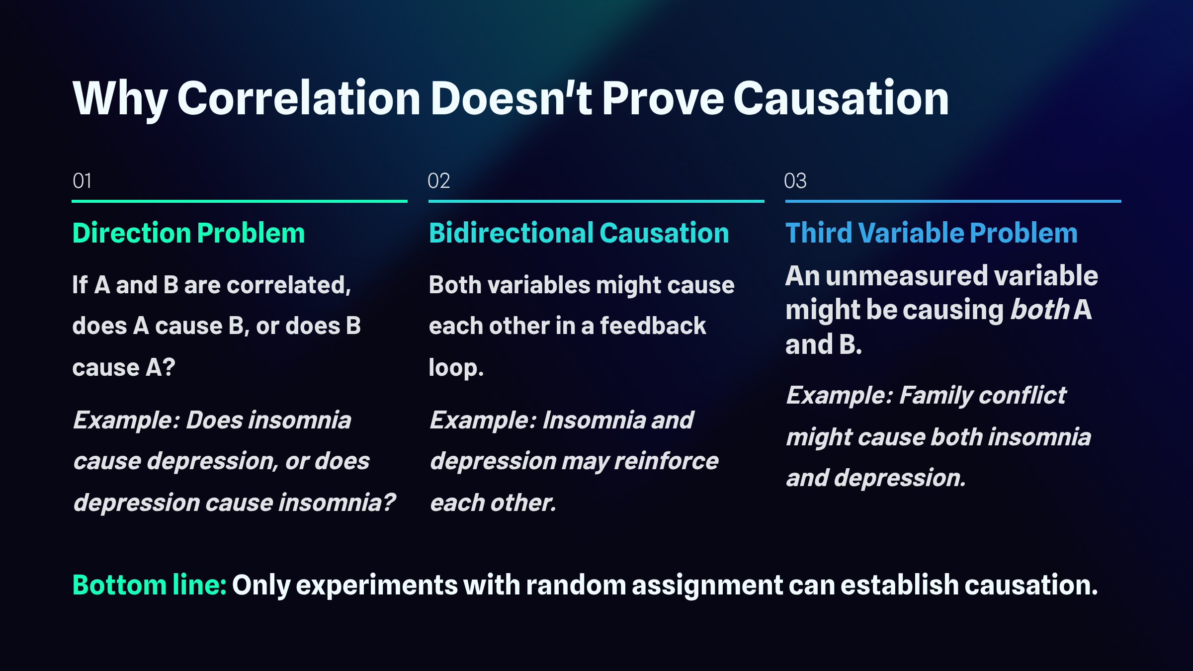 third variable problem: a reason that correlation does not mean causation. A hidden variable may affect both correlated variables. For example, alcohol abuse could both disrupt sleep and increase depression.