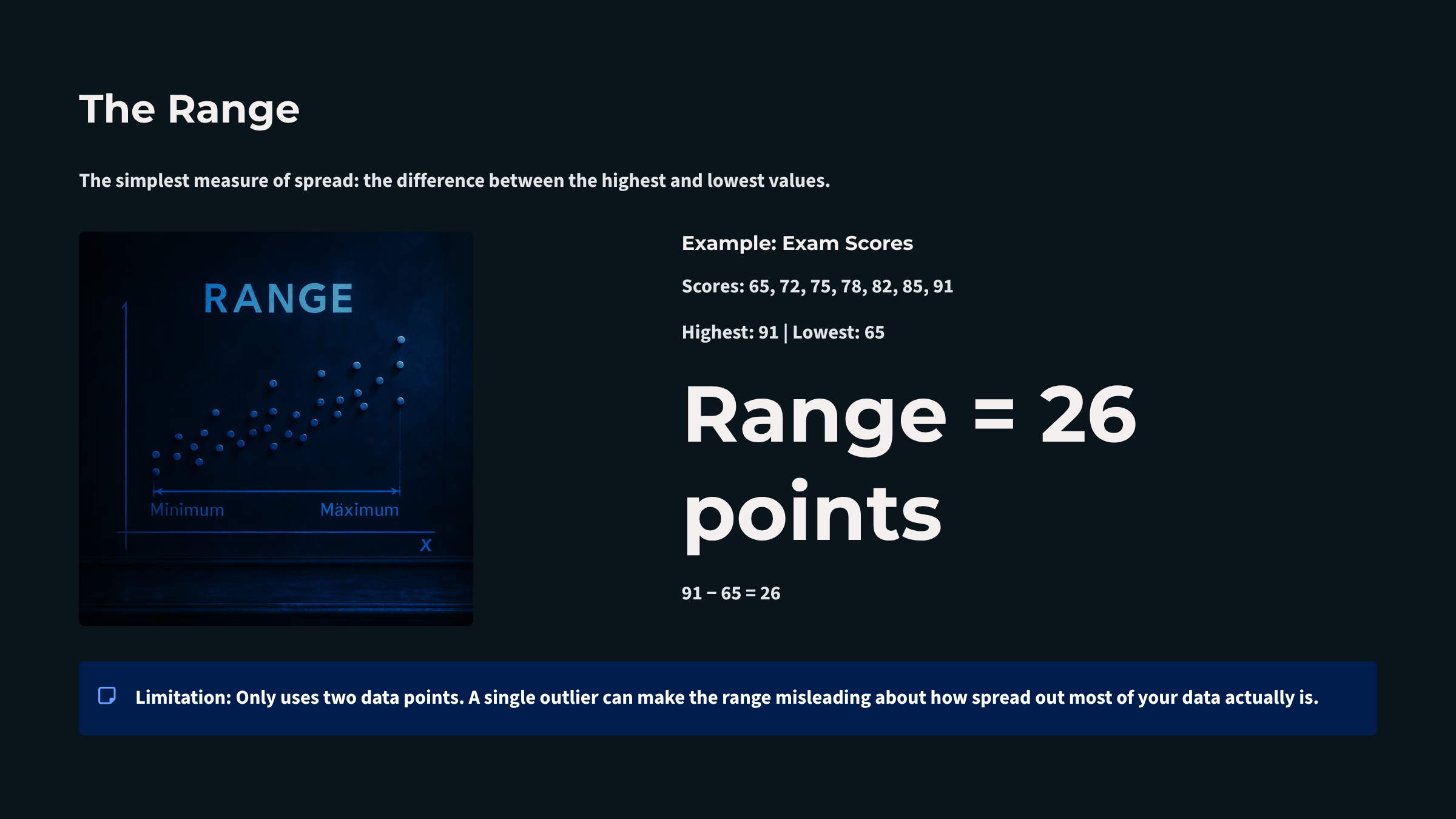 range: the difference between the lowest and highest values.