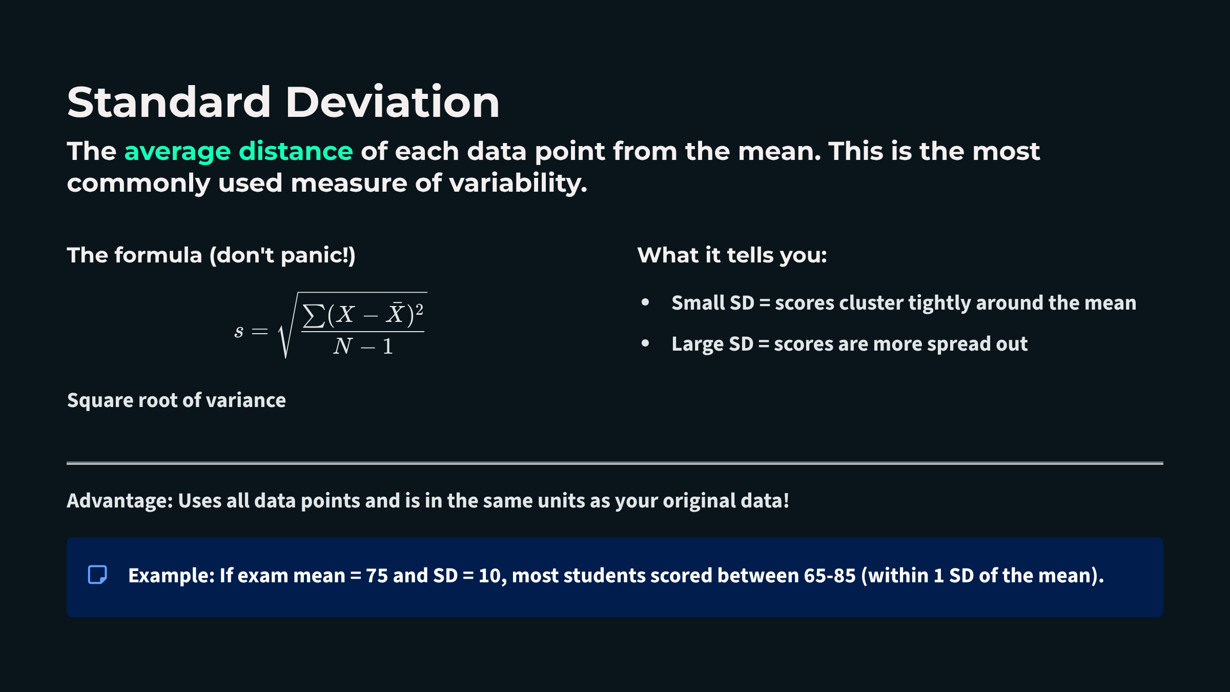 standard deviation: the square root of the average squared deviations from the mean.
