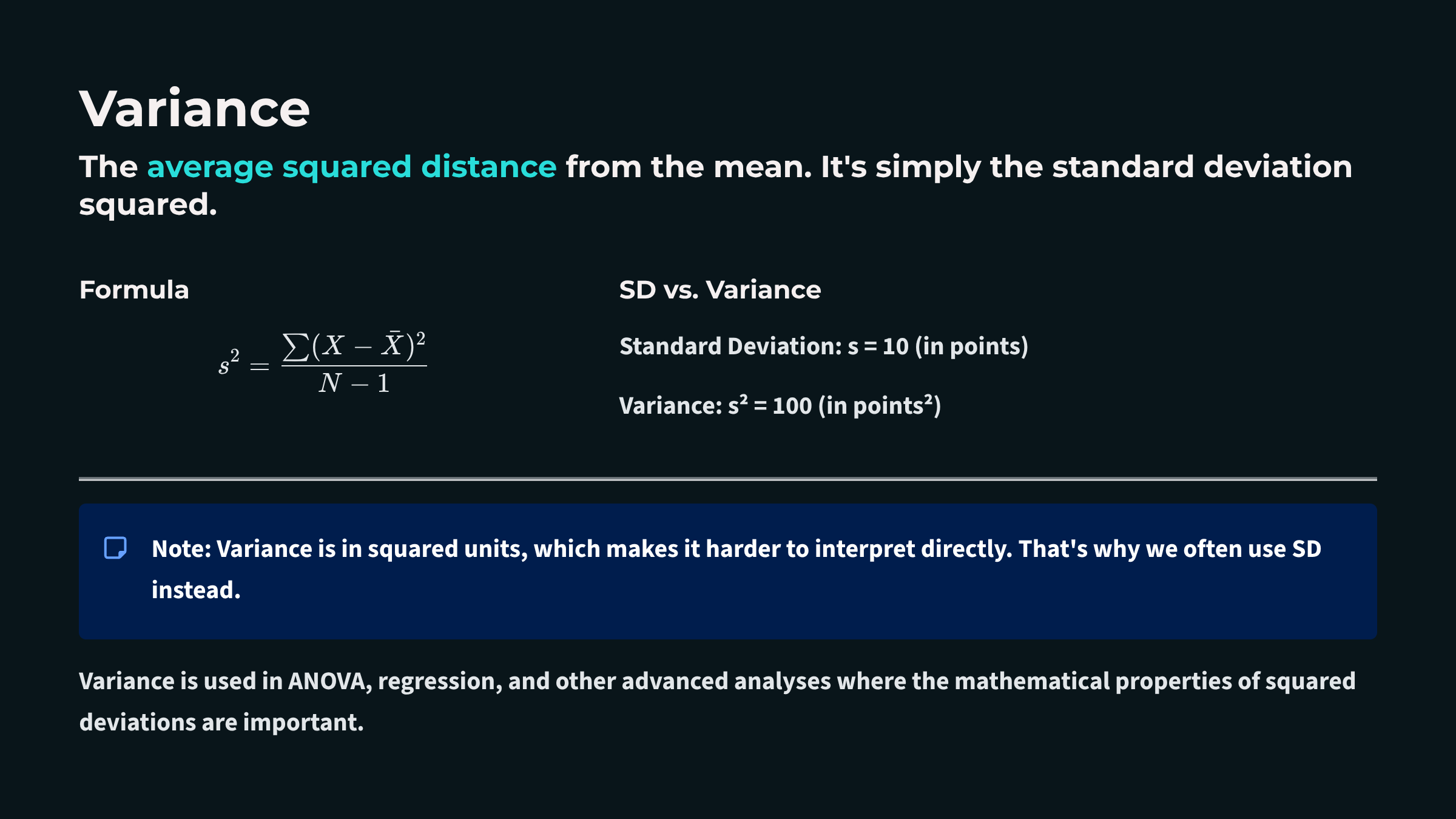 variance: the average squared deviation of scores from their mean.
