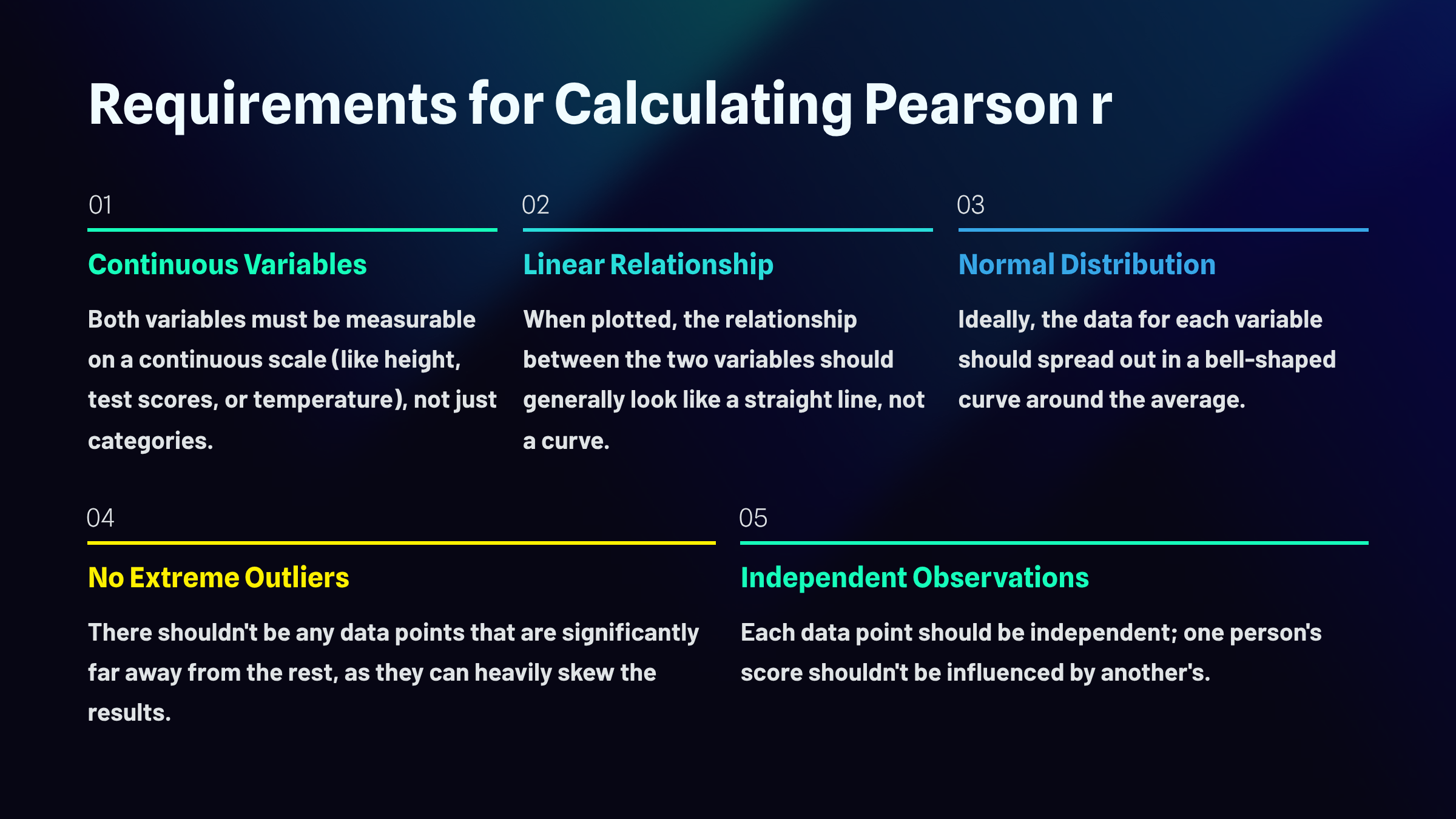 Before you can trust what a correlation coefficient tells you, you need to make sure your data actually meet the conditions that make correlation meaningful in the first place. Think of these as the ground rules that need to be in place before the math can do its job properly.