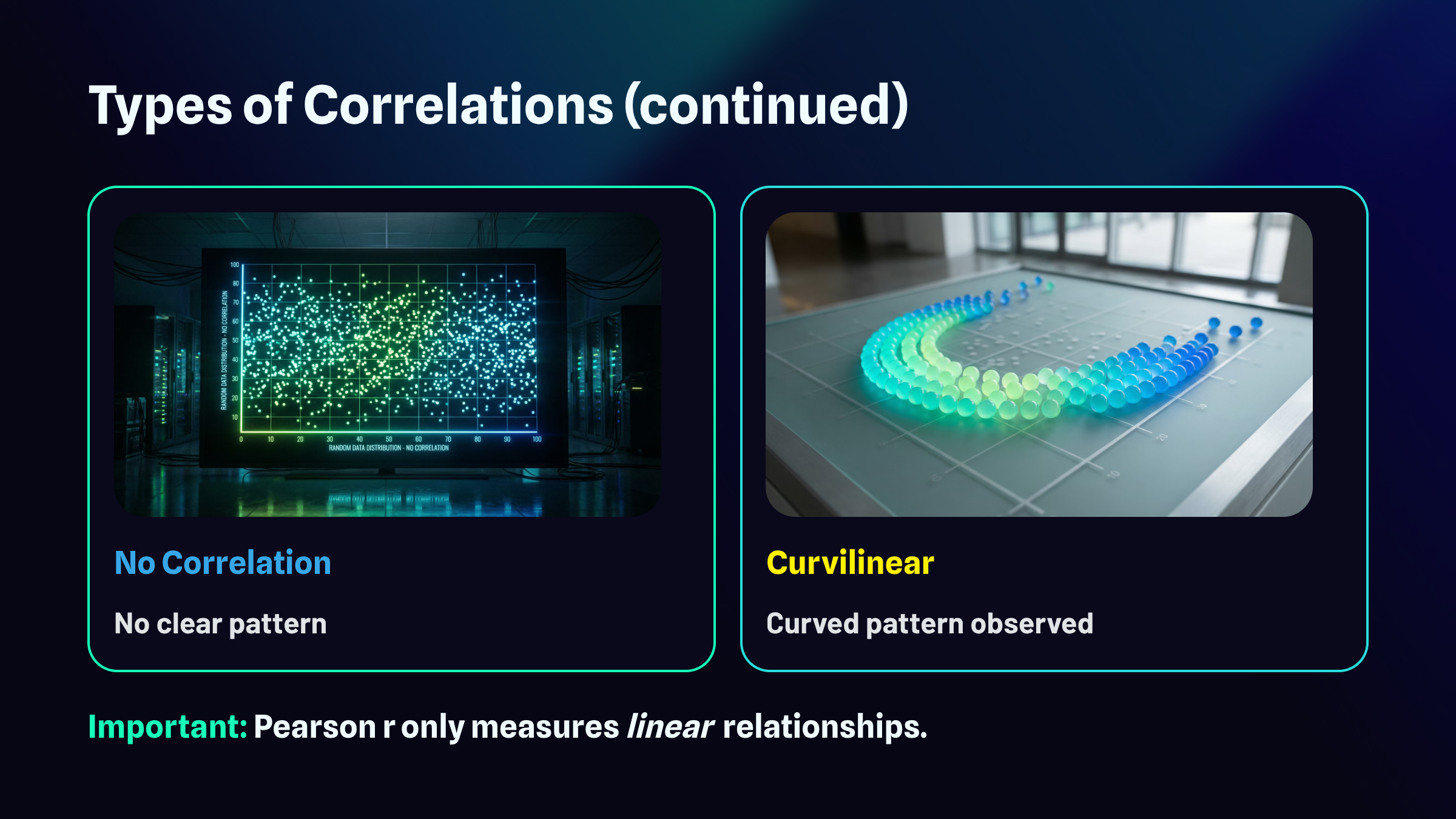 Second, the relationship between your two variables should be roughly linear. If you were to plot all your data points on a graph, you'd want them to cluster around an imaginary straight line, whether that line slopes upward, downward, or stays relatively flat. Correlation isn't designed to detect curved or U-shaped relationships. It's looking for straight-line patterns, and if your data actually follow a curve, the correlation coefficient will completely miss the boat.