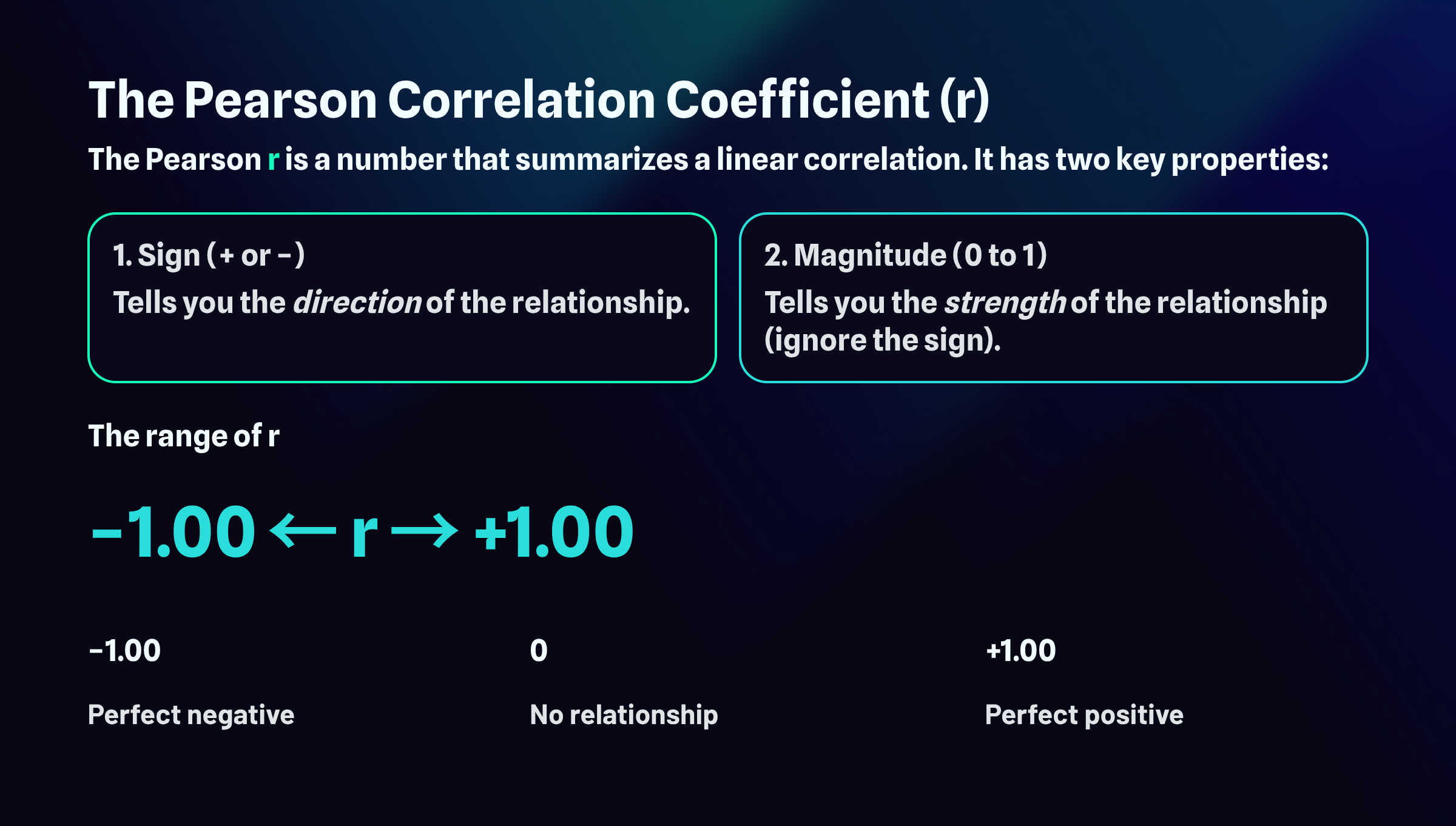 The Pearson r is a single number that captures everything you need to know about a linear correlation. Rather than staring at a scatterplot and guessing whether the relationship looks strong or weak, you can compute this coefficient and get a precise summary. Two properties embedded in this one number tell you different things about the relationship you're examining.