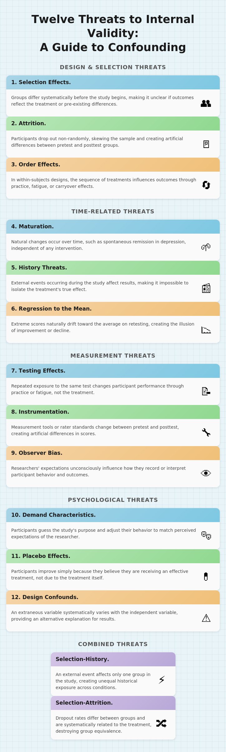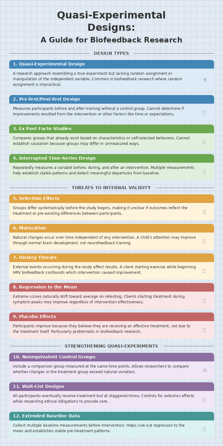 Time-related confounds present another family of threats. Maturation refers to natural changes that occur within participants simply because time has passed. In clinical settings, this phenomenon often appears as spontaneous remission, where symptoms improve on their own without any treatment. Consider a study evaluating a new therapy for depression. If participants report feeling better after eight weeks, you might credit the therapy, but depression often lifts naturally over time as life circumstances change, social support kicks in, or neurochemical fluctuations stabilize. Without a comparison group, you cannot know whether the therapy helped or whether participants would have improved anyway.