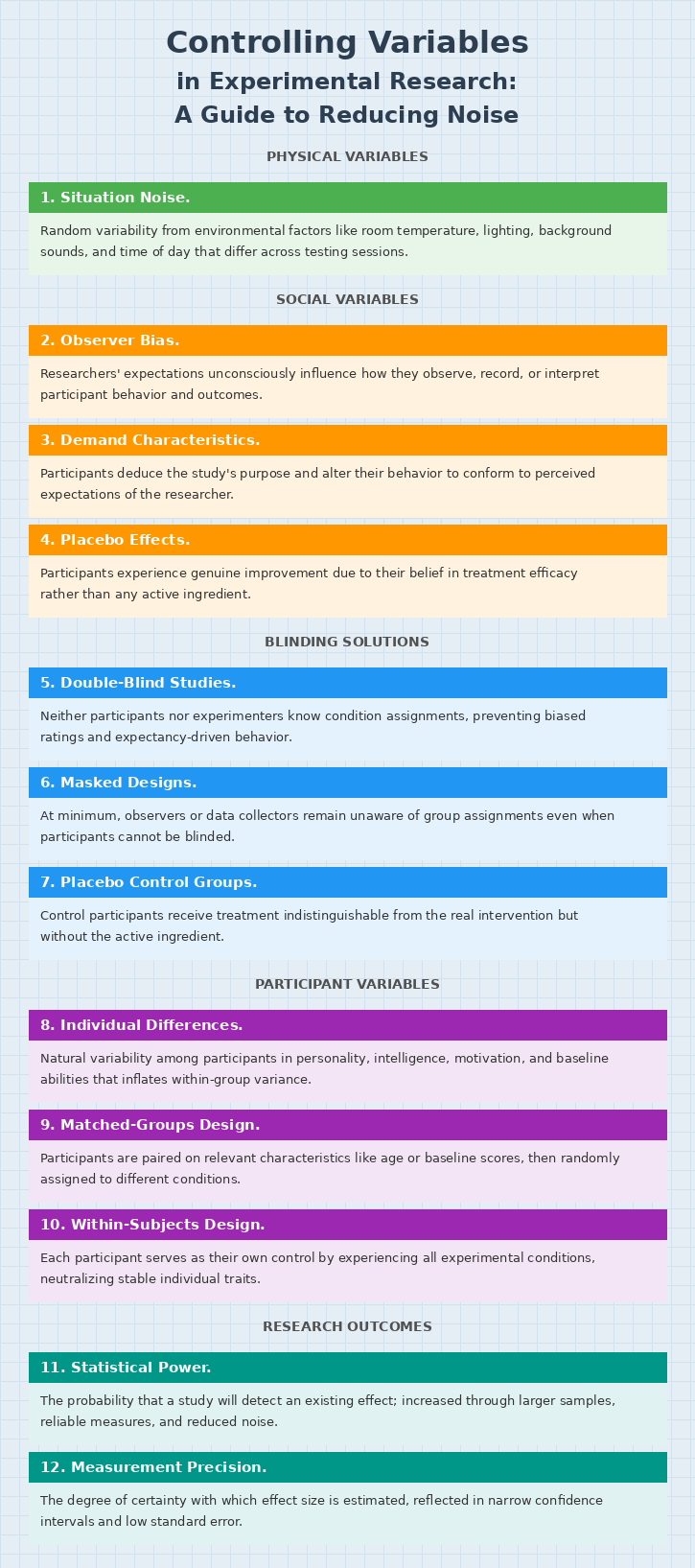Even when researchers craft strong manipulations and select sensitive measures, experiments can still fail to detect real effects if too much uncontrolled variability clouds the data. This unwanted variability, often called noise or error variance, refers to differences in how individuals respond to the same experimental condition that have nothing to do with the independent variable. When scores within each condition scatter widely due to factors unrelated to the treatment, the statistical comparison between group means becomes murky, and genuine effects may slip beneath the threshold of detection. Researchers must therefore anticipate and control three broad categories of extraneous influence: physical variables arising from the testing environment, social variables stemming from interactions between experimenters and participants, and participant variables rooted in individual differences among the people being studied.
