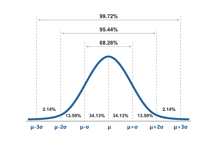 normal distribution: a symmetrical bell-shaped distribution where most values cluster near the average and fewer scores appear at the extremes.