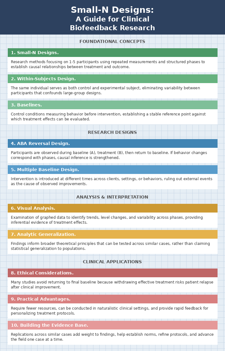 In this chapter, you will discover the critical differences between experimental and nonexperimental designs and why only experiments can establish cause-and-effect relationships. You will learn about the "gold standard" randomized controlled trial and the challenges researchers face in creating appropriate control conditions for biofeedback studies. We will explore the sobering reality of questionable research practices and what the field is doing to improve scientific integrity. You will master descriptive and inferential statistics, including how to interpret effect sizes that tell you whether a treatment actually matters clinically. Finally, you will understand the five levels of clinical efficacy that guide evidence-based practice in our field.