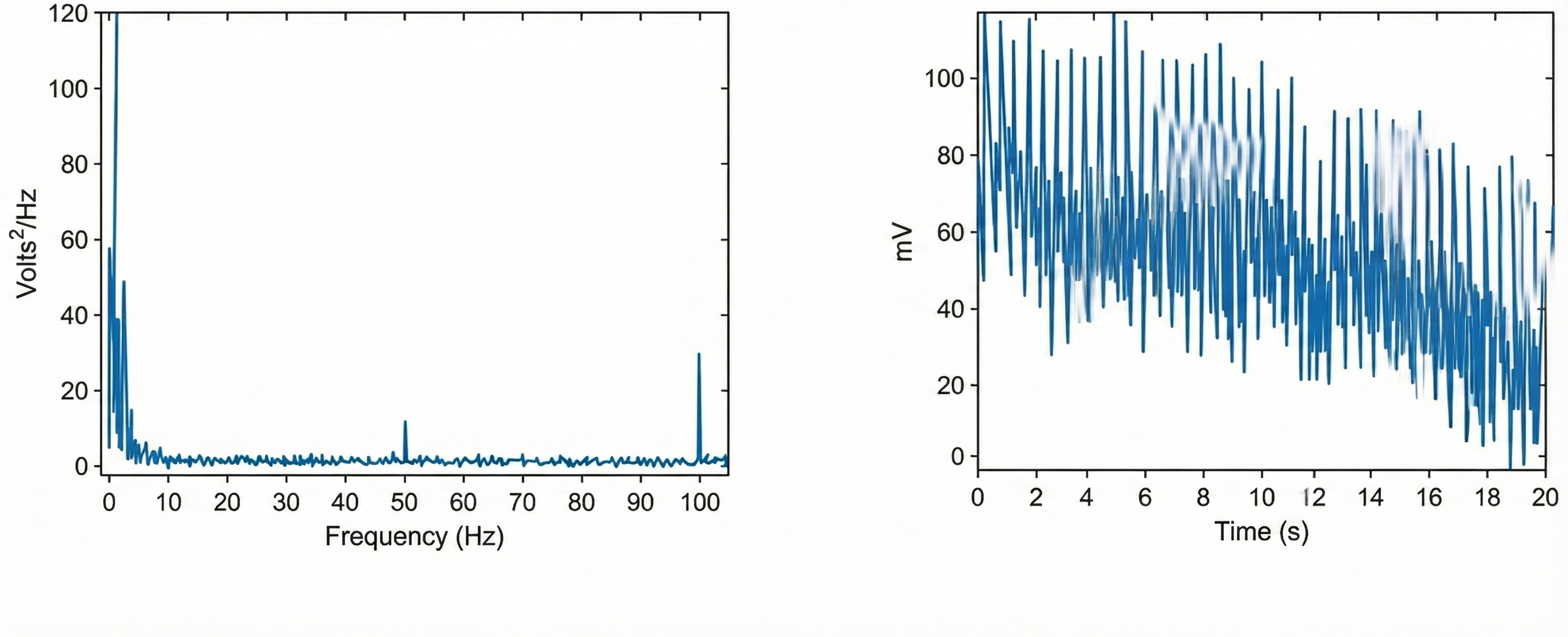 You may not see line interference if your data acquisition system includes built-in filters that remove the high-frequency component of the raw BVP signal before displaying it. However, the contamination still affects underlying measurements. The graphic below from Elgendi shows a 50-Hz peak and 100-Hz harmonic in frequency analysis (left) and contamination of the raw BVP signal (right). The harmonic at double the line frequency is a characteristic signature of power line interference.