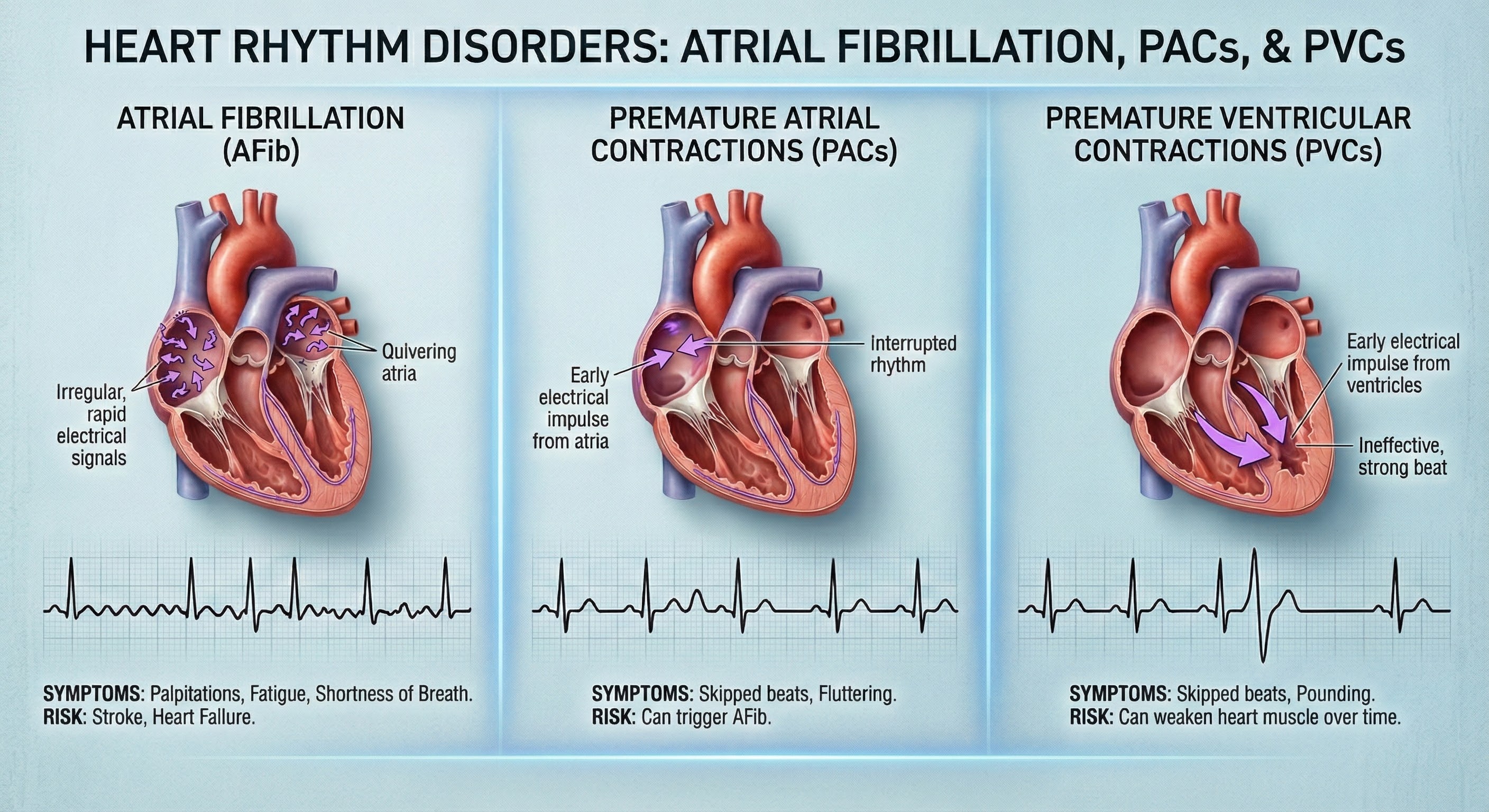 premature ventricular contractions (PVCs): extra heartbeats originating in the ventricles instead of the SA node, followed by a compensatory pause. Creates characteristic short-long interval pairs that distort HRV metrics.