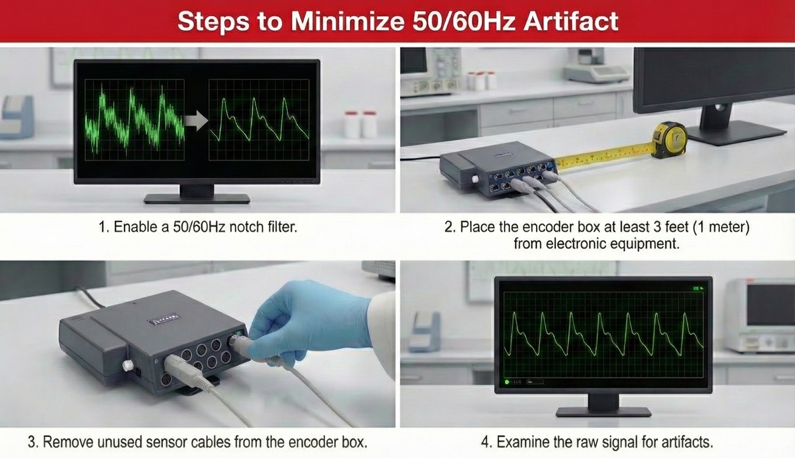 To minimize 50/60Hz artifact, use a notch filter if your equipment provides one. A notch filter selectively removes a narrow frequency band centered on the line frequency while preserving the rest of the signal. Place the encoder box at least 3 feet (1 meter) from electronic equipment including computers, monitors, smartphones, and fluorescent light ballasts, which can radiate significant electromagnetic interference. Remove unused sensor cables from the encoder box to reduce antenna effects, as dangling cables act as antennas that collect electromagnetic interference. Always examine the raw signal for artifact, looking for the characteristic ripple pattern during signal downswings.