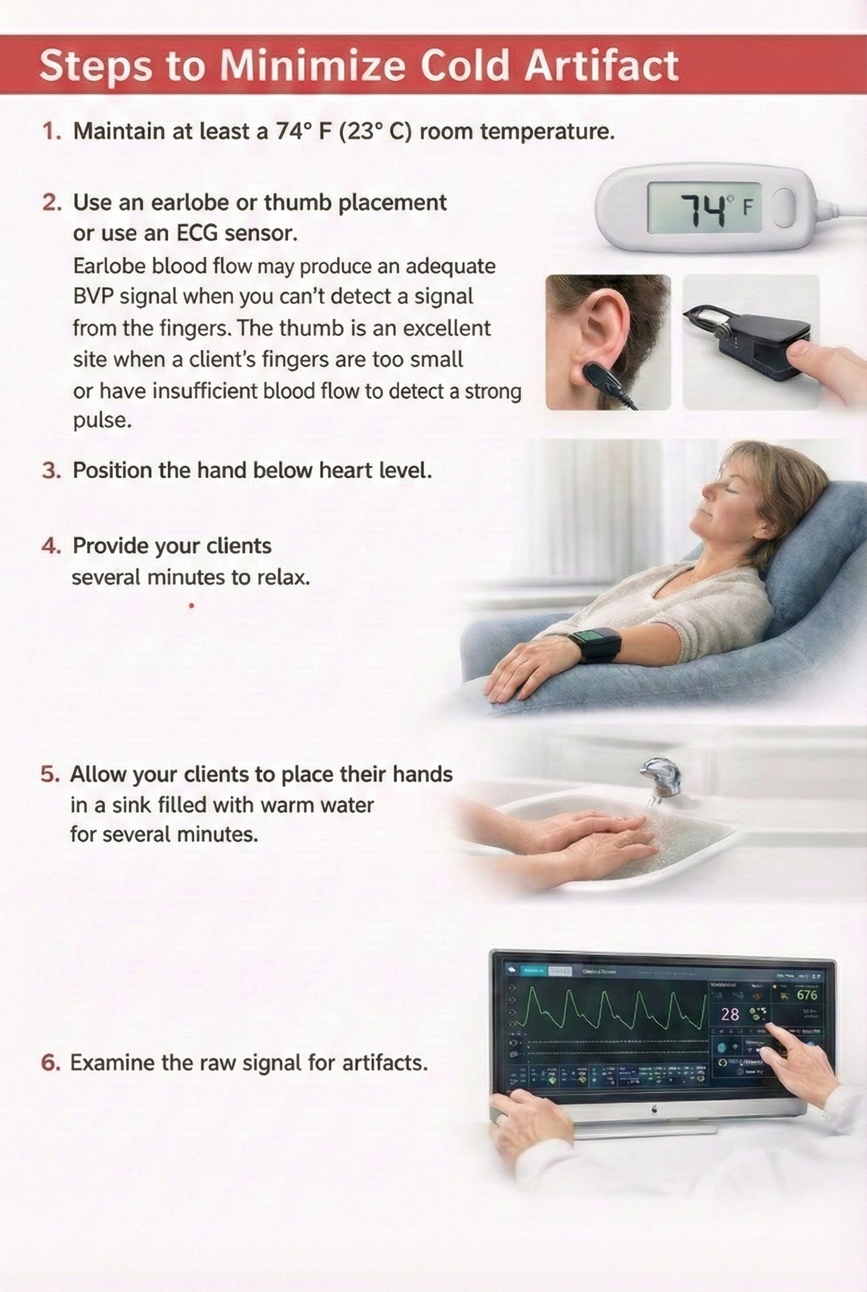 To minimize cold artifact, maintain room temperature at least 74 degrees Fahrenheit (23 degrees Celsius). Cold clinical environments are a common cause of poor BVP recordings, particularly in hospital settings where air conditioning runs continuously. Use an earlobe or thumb placement or switch to an ECG sensor when finger signal is inadequate. The earlobe often produces an adequate BVP signal even when finger readings fail because the ear receives blood from the external carotid artery and is less susceptible to sympathetically-mediated vasoconstriction. The thumb is an excellent alternative site when a client's fingers are too small or have insufficient blood flow to detect a strong pulse (Peper, Shaffer, & Lin, 2010).