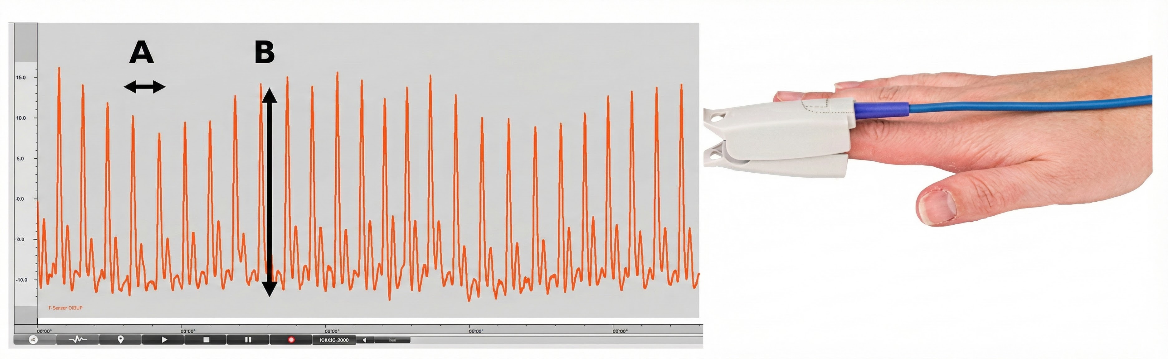Understanding the two fundamental measurements derived from the BVP signal will help you interpret what your biofeedback display is actually showing. The interval between successive peaks (A) is called the interbeat interval (IBI), measured in milliseconds. This is the foundation for all HRV calculations. The peak-to-trough difference (B) shows the relative blood flow (Elgendi, 2012), which varies with sympathetic activation and vascular tone.