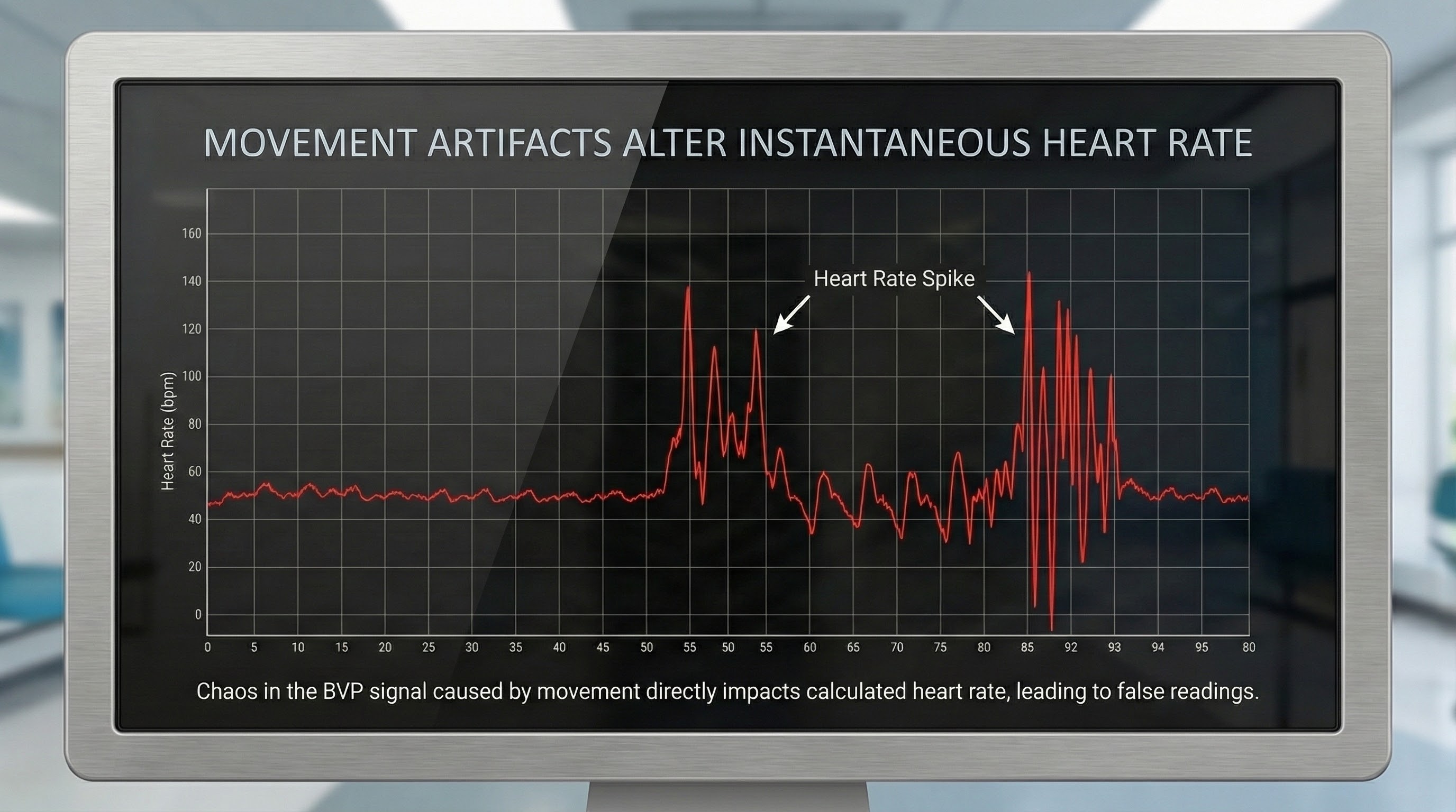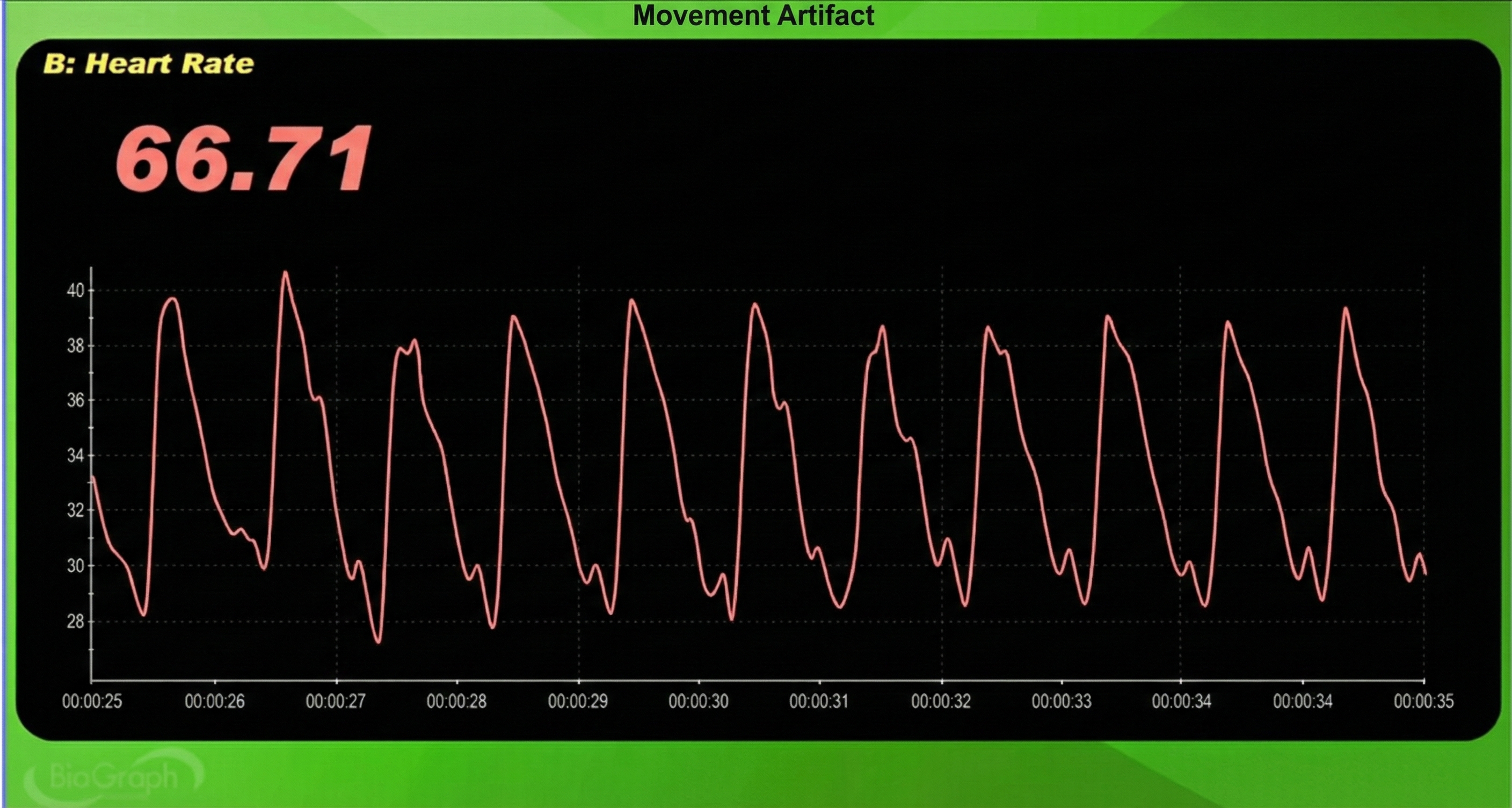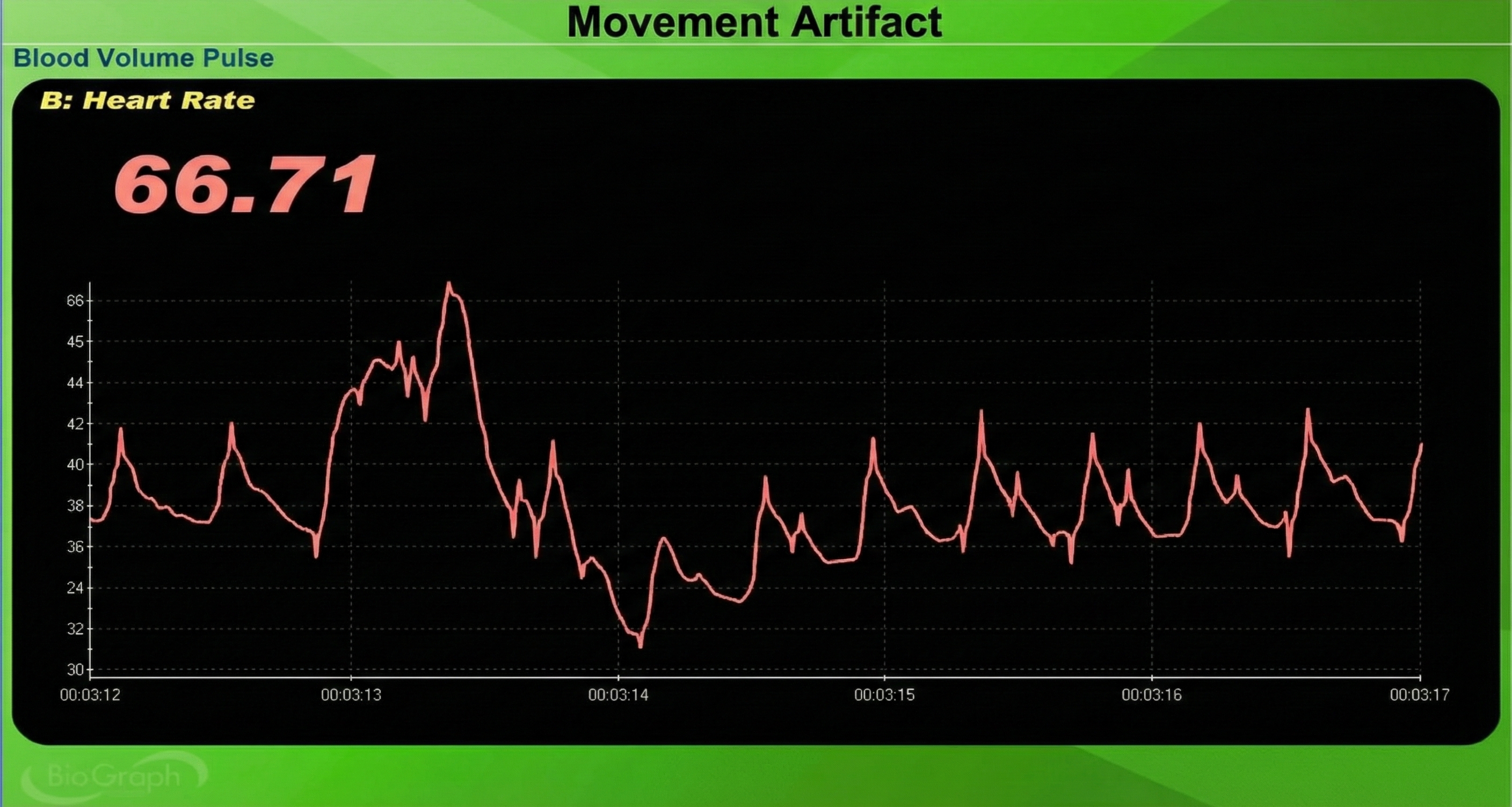Sensor movement artifact is the leading cause of BVP signal distortion and can eliminate the signal entirely or result in extra or missed beats (Elgendi, 2012; Shaffer & Combatalade, 2013). Even subtle movements, such as shifting weight in a chair, adjusting posture, or the natural tremor that accompanies muscle tension, can dramatically affect signal quality. Understanding why movement causes artifact helps you explain the importance of stillness to your clients.