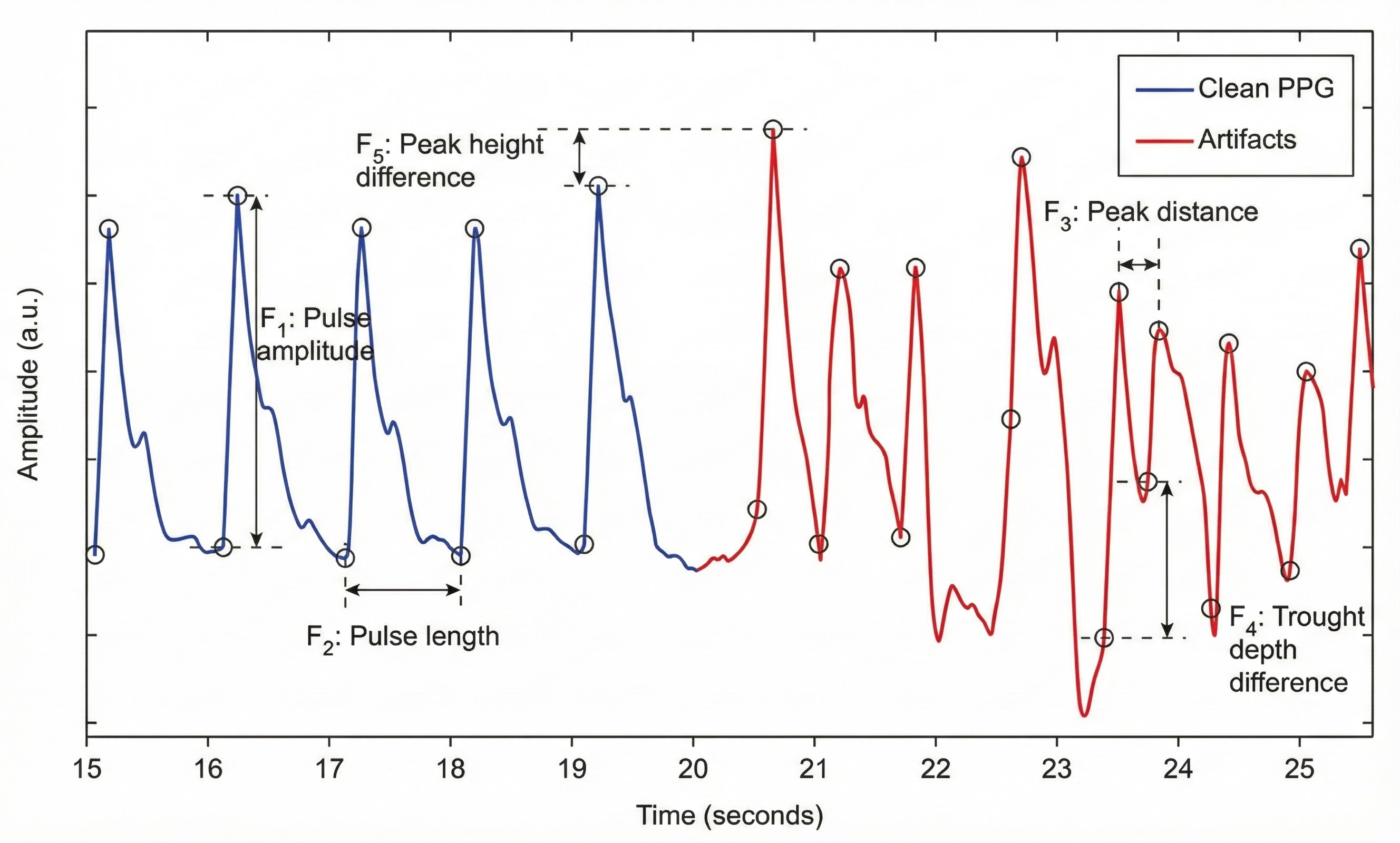 Couceiro, R., Carvalho, P., Paiva, R. P., Henriques, J., & Muehlsteff, J. (2014). Detection of motion artifact patterns in photoplethysmographic signals based on time and period domain analysis. Physiological Measurement, 35(12), 2369-2388.