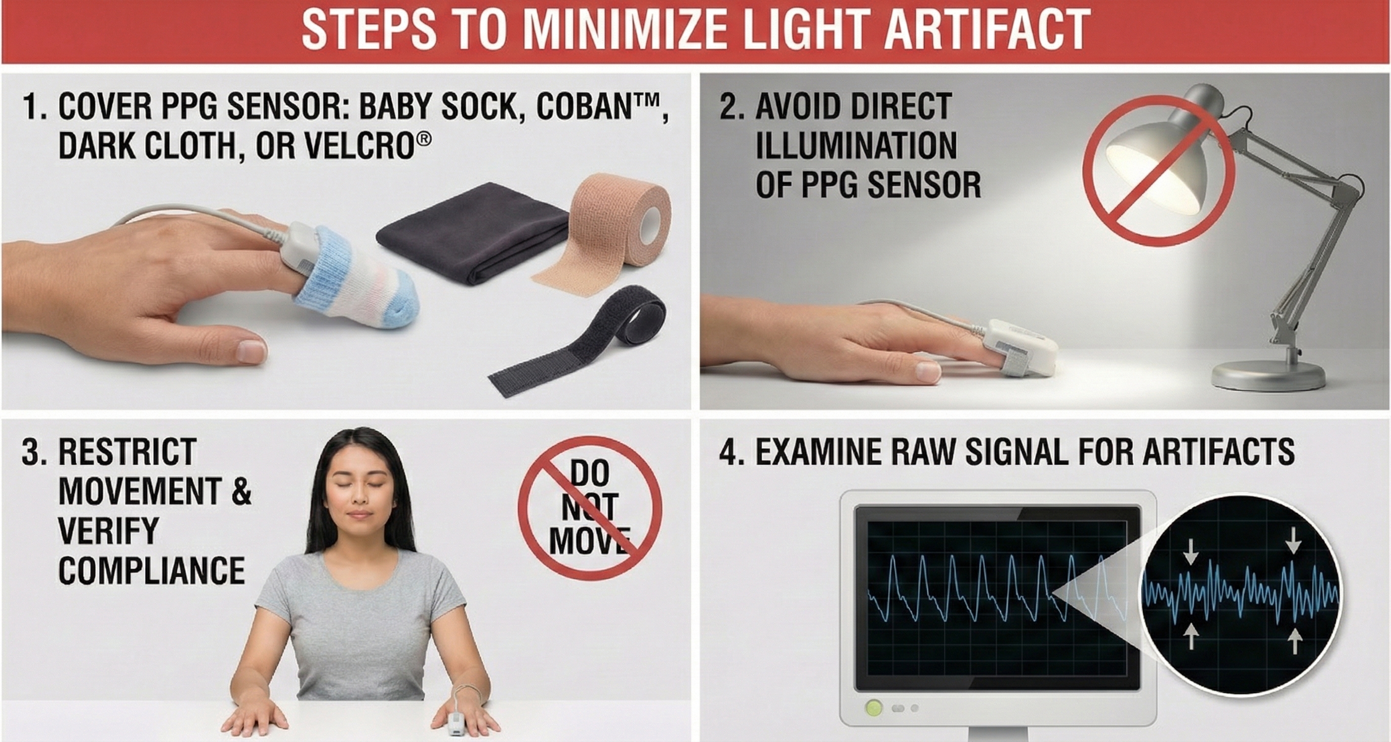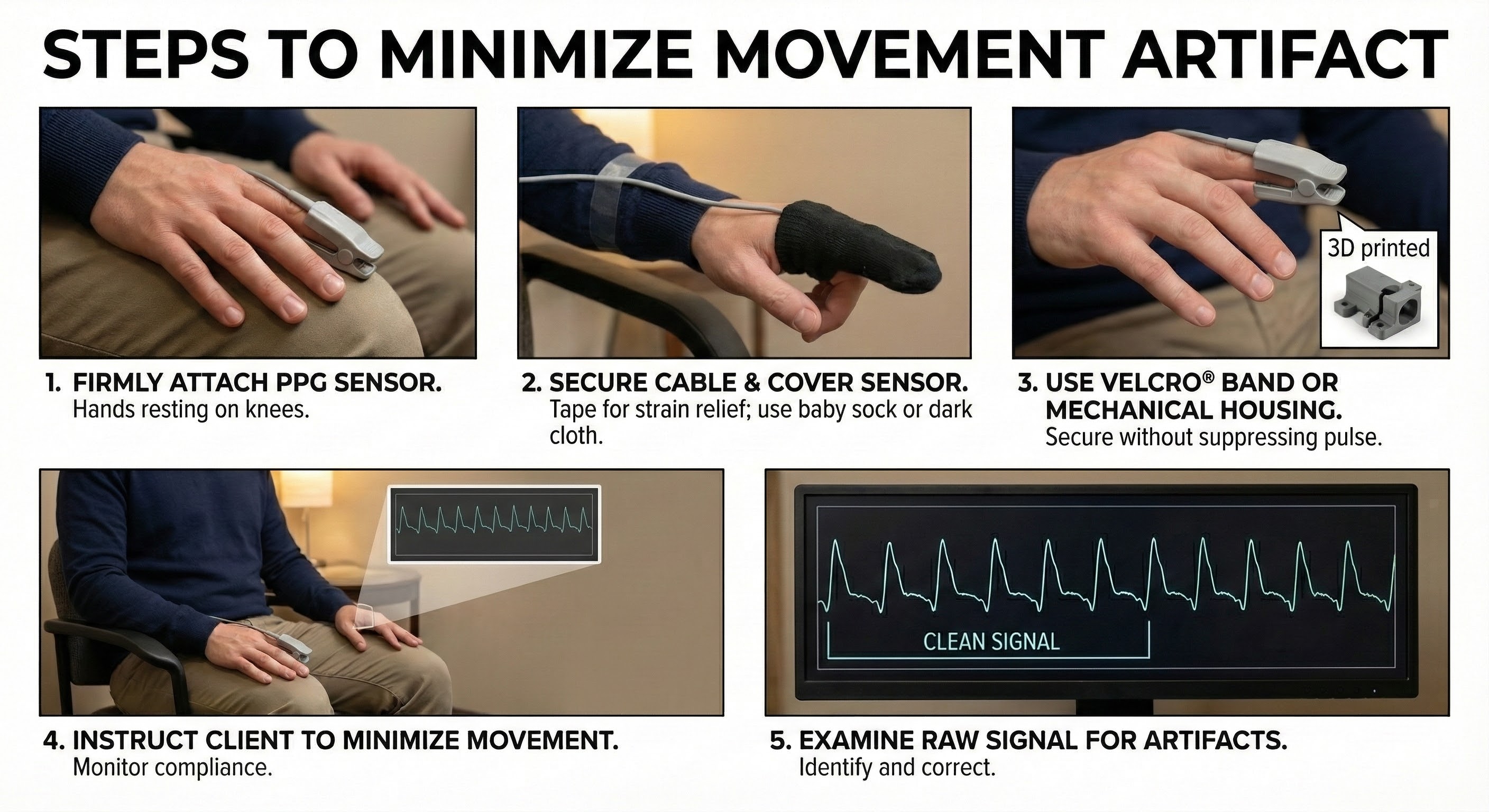 To minimize light artifact, cover the PPG sensor with a baby sock (an inexpensive and effective solution), Coban tape, a dark cloth, or Velcro band that wraps around the sensor housing. Avoid direct illumination of the PPG sensor, particularly from windows (which can introduce both sunlight and reflections), desk lamps, or overhead fluorescent lights that flicker at line frequency. Position the client so that the sensor faces away from light sources. Instruct clients to restrict movement and verify compliance throughout the session, as movement can shift the covering and allow light to enter. Always examine the raw signal for artifact, comparing the signal quality when the sensor is covered versus uncovered.