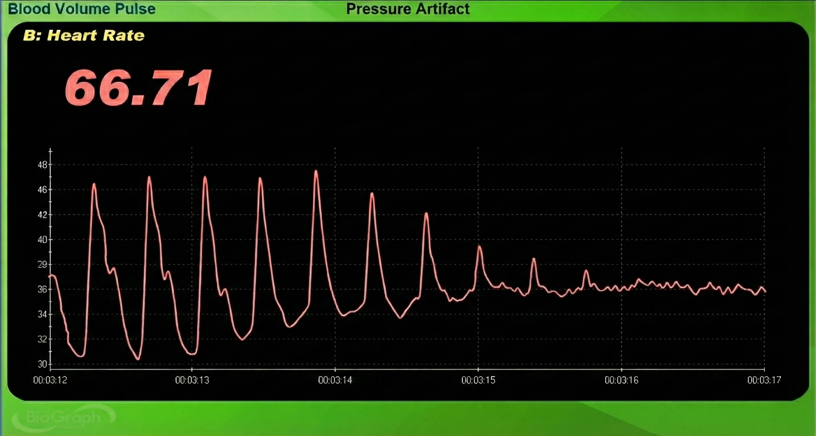 Blood volume pulse could easily drop 50-60% in a patient who is a vascular responder, an individual whose fingers cool when challenged by stressors due to sympathetically-mediated vasoconstriction. This sensitivity makes PPG valuable for stress profiling and for clients learning to recognize early signs of sympathetic activation. When a client experiences a plateau in temperature biofeedback and ceases to warm further, a clinician could switch to blood volume pulse biofeedback to continue progress if the monitored hand is not significantly vasoconstricted (Peper, Shaffer, & Lin, 2010). This therapeutic flexibility allows you to maintain client engagement and momentum even when one modality reaches its limits.