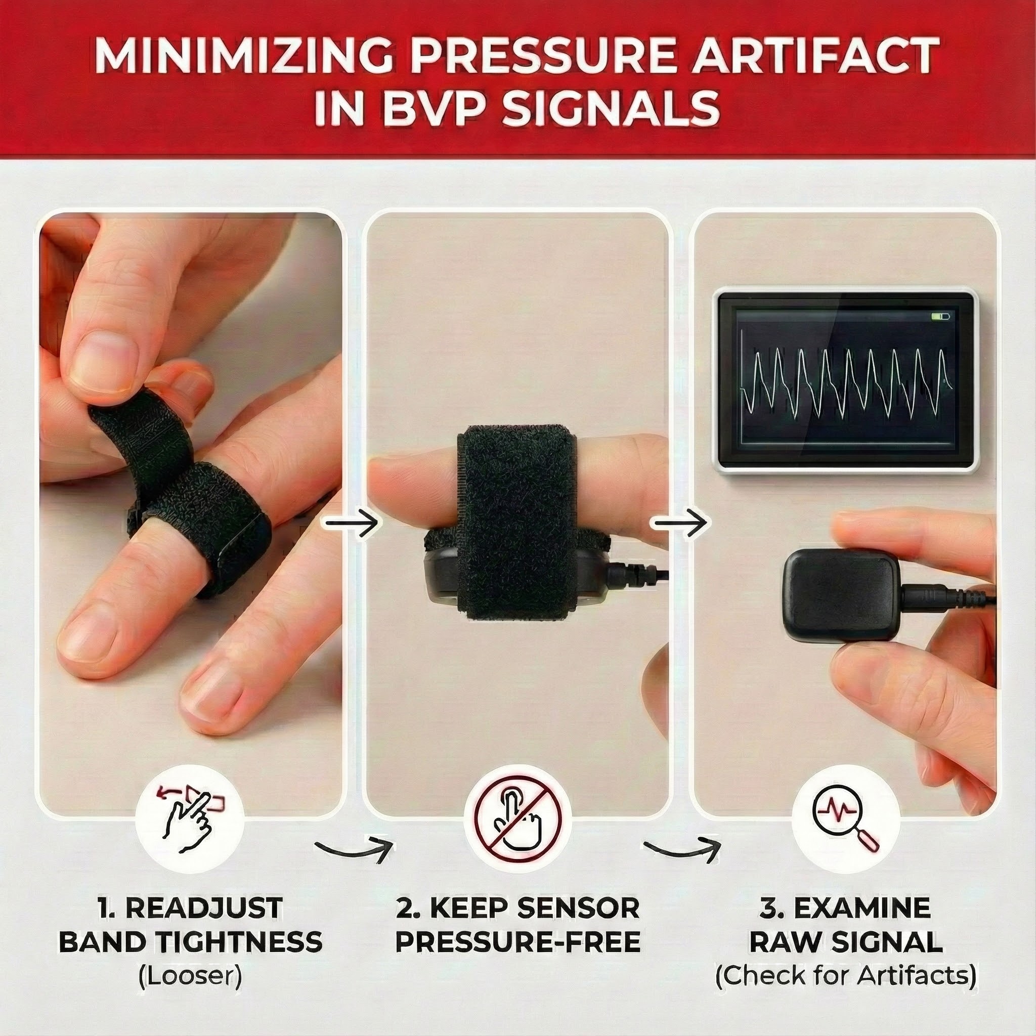 Use clean BVP recordings as a reference point. Knowing what a good signal looks like makes it easier to spot when something has gone wrong. Study the examples throughout this section until you can recognize artifact patterns at a glance.