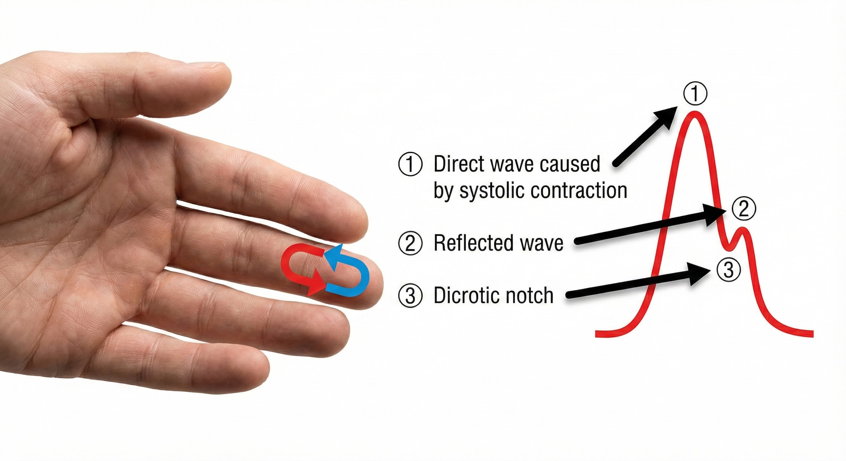 Blood appears red because it reflects red wavelengths. More light is reflected, and the BVP signal increases when the volume of blood increases. (1) As blood surges, more light is reflected, and the BVP signal peaks as the volume of blood increases. (2) As the pulse wave travels through the vascular tree, it is reflected by the lower body and appears as a second smaller peak. (3) The dicrotic notch is the gap between the direct and reflected waves.