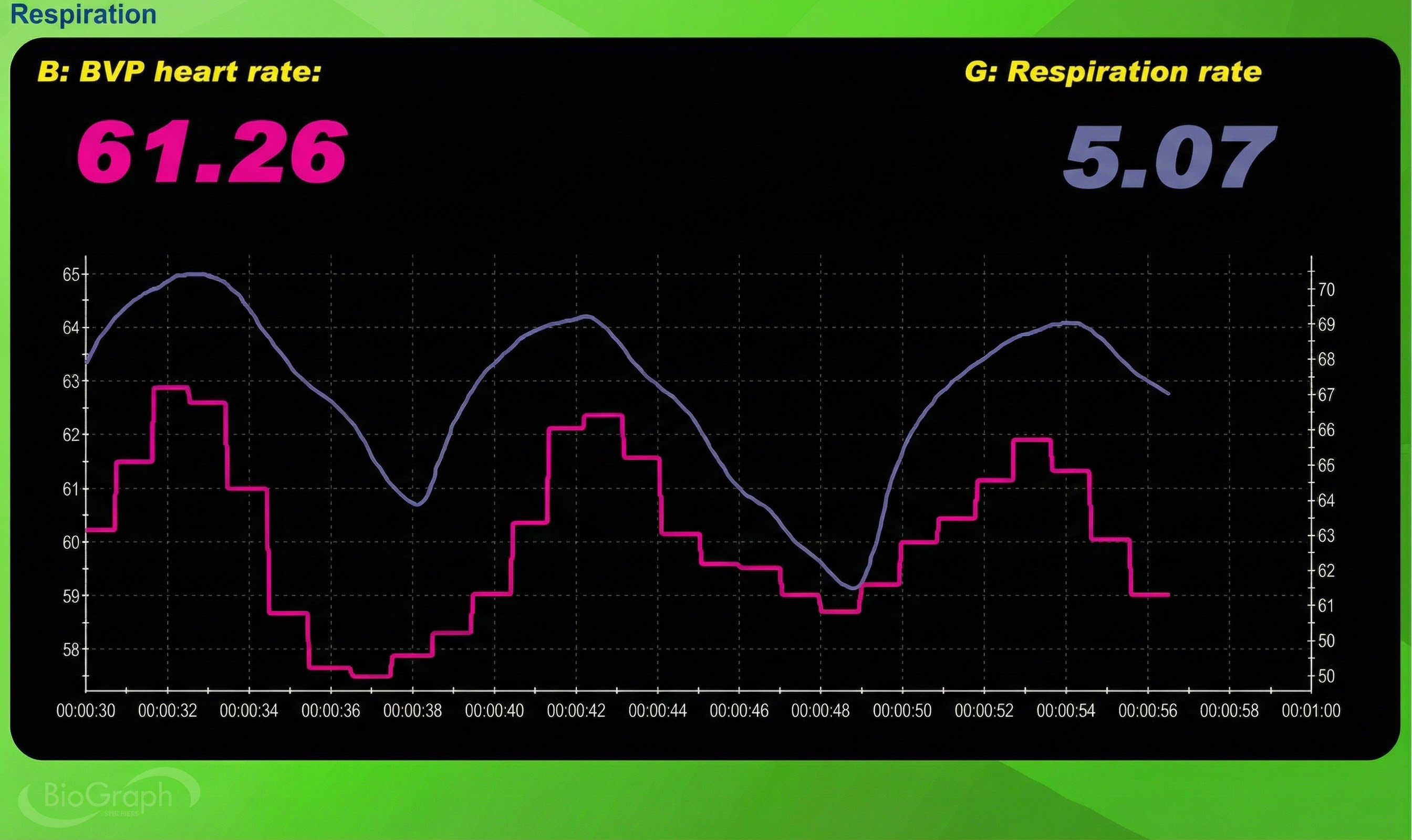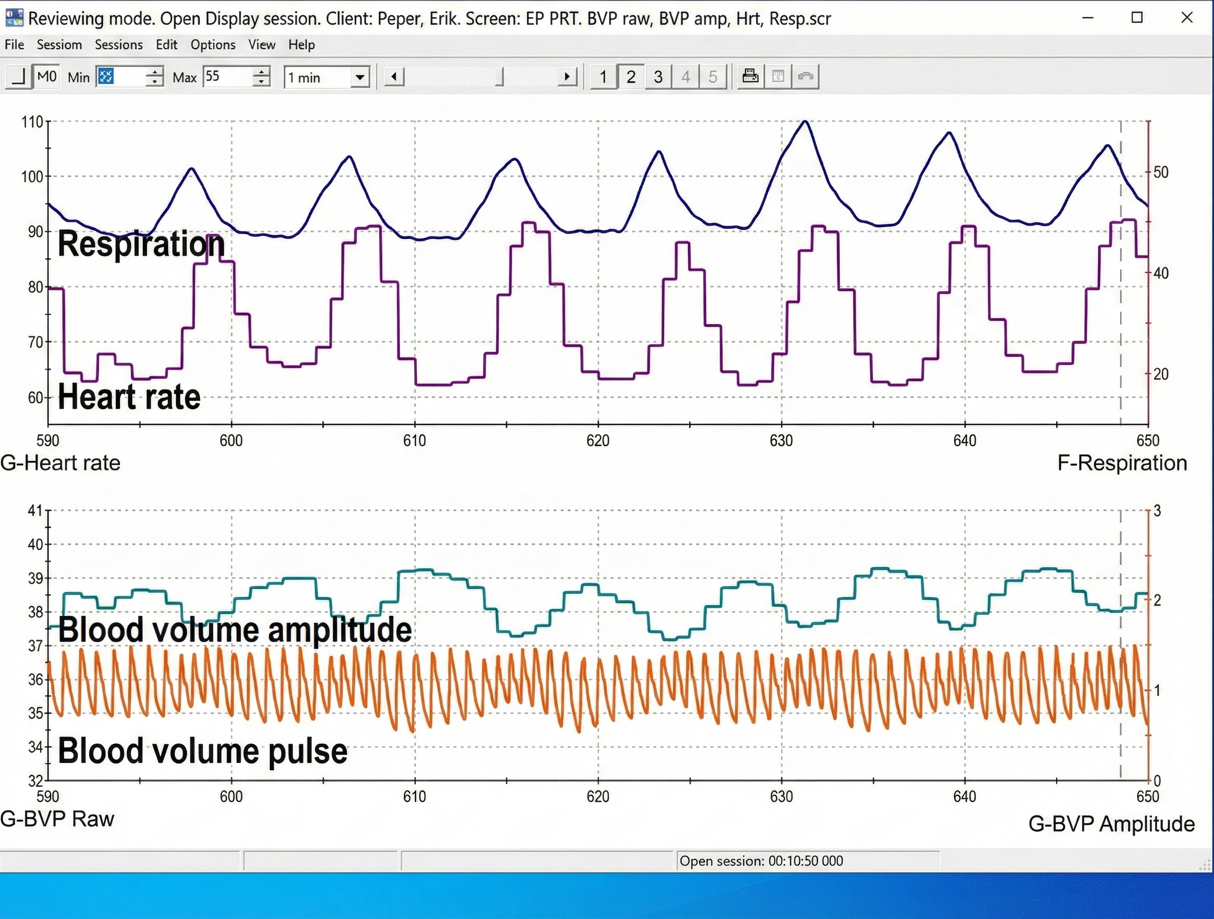 Clinicians may simultaneously monitor blood volume pulse, blood volume amplitude (relative volume of blood), HR, and respiration during training to increase HRV, as shown in the display below from Peper, Harvey, Lin, Tylova, and Moss (2007).