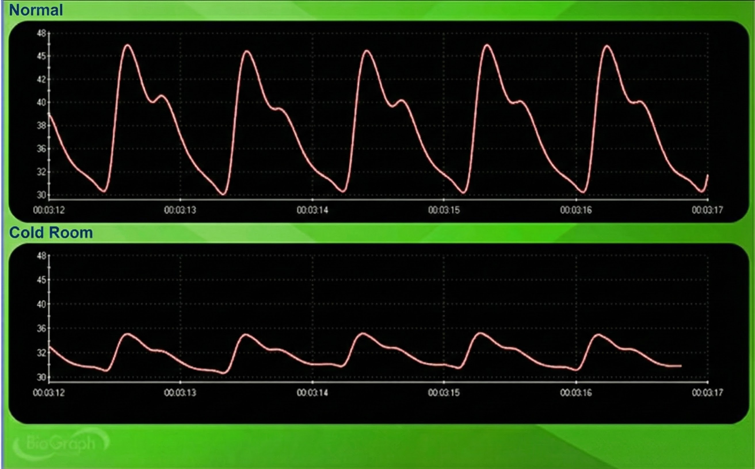 Cold artifact, produced by cold exposure or sympathetically-mediated vasoconstriction, can reduce or eliminate a pulse wave entirely. When peripheral blood vessels constrict severely, insufficient blood flow reaches the sensor site to produce a detectable signal. Cold artifact may result in missed beats when the software cannot identify peaks in the attenuated signal, producing artifactually-lengthened interbeat intervals (Shaffer & Combatalade, 2013). The software waits for the next detectable beat, making the interval appear much longer than the actual cardiac cycle.