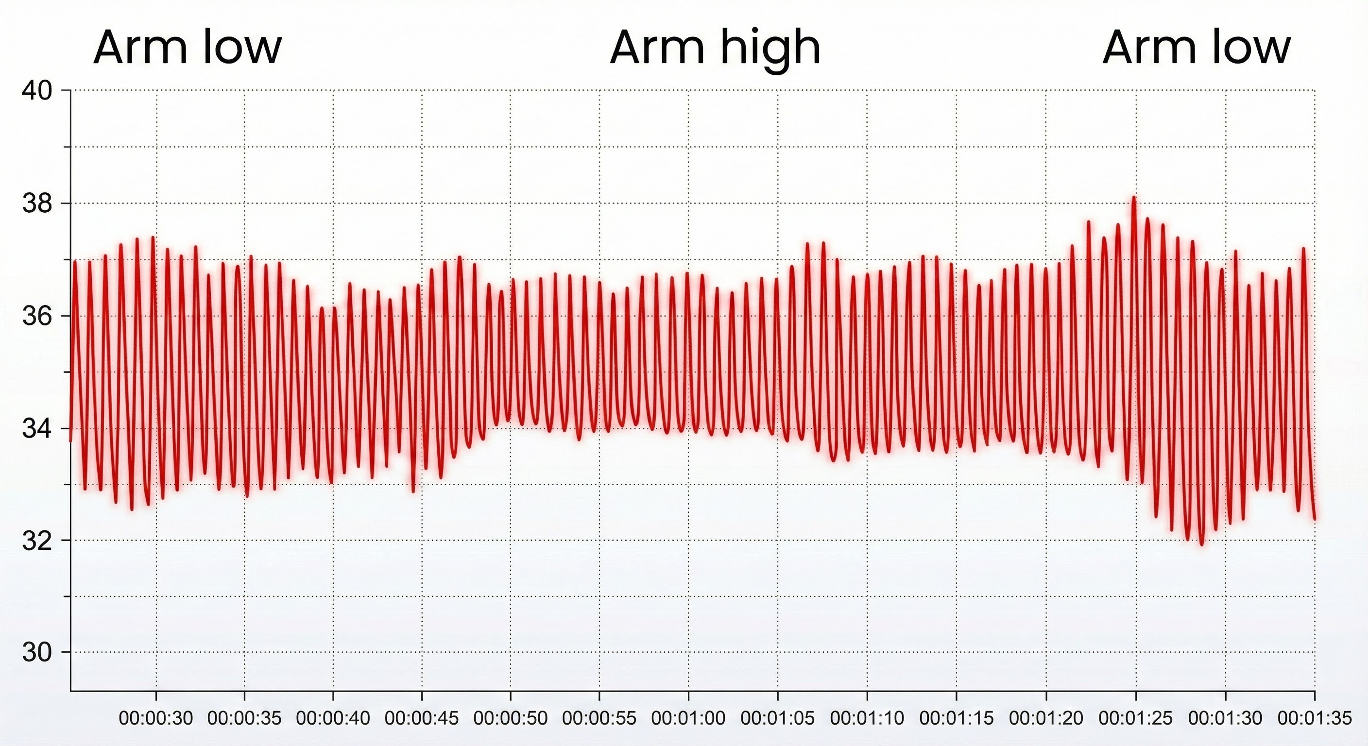 Ryan, a veteran being treated for PTSD at your VA clinic, arrives for his session complaining that his PPG signal looks weak and erratic. Before assuming equipment problems or blaming his anxiety, check his arm position. If he has been resting his hand on a high armrest with his elbow above heart level, simply repositioning his arm to rest on his lap may immediately strengthen the signal. This simple troubleshooting step saves time and demonstrates to Marcus that you understand the technology well enough to solve problems efficiently.
