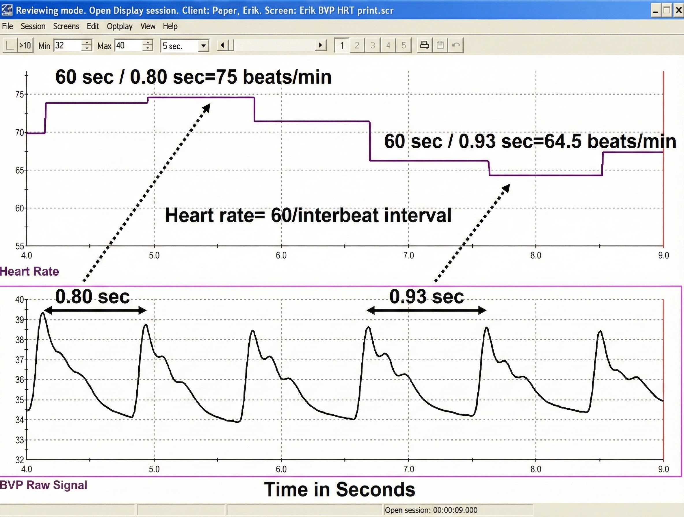 Each heartbeat briefly increases blood volume in the arteries and capillary beds. The blood volume pulse signal can be used to calculate HR (beats per minute) by measuring the interbeat interval (the period between successive heartbeats). Divide the time interval between peaks by 60 seconds to calculate HR (Peper, Harvey, Lin, Tylova, & Moss, 2007).