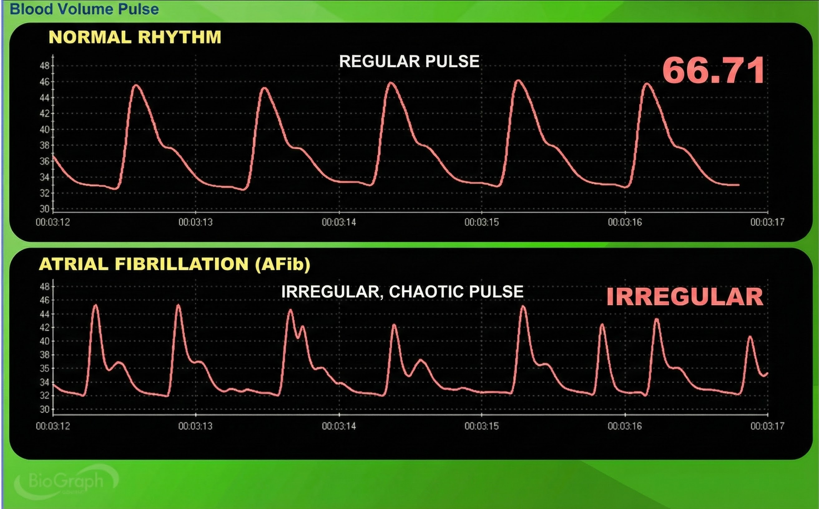 atrial fibrillation: a supraventricular arrhythmia characterized by chaotic cardiac conduction and rapid heart rates that can produce low-amplitude, irregular BVP signals. HRV metrics are not meaningful during atrial fibrillation.