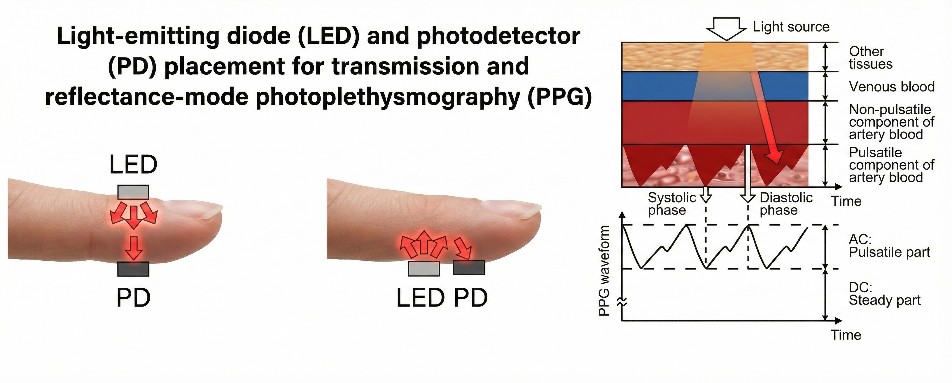 - Explain the difference between transmission and reflection PPG techniques. When might you choose one over the other in clinical practice?