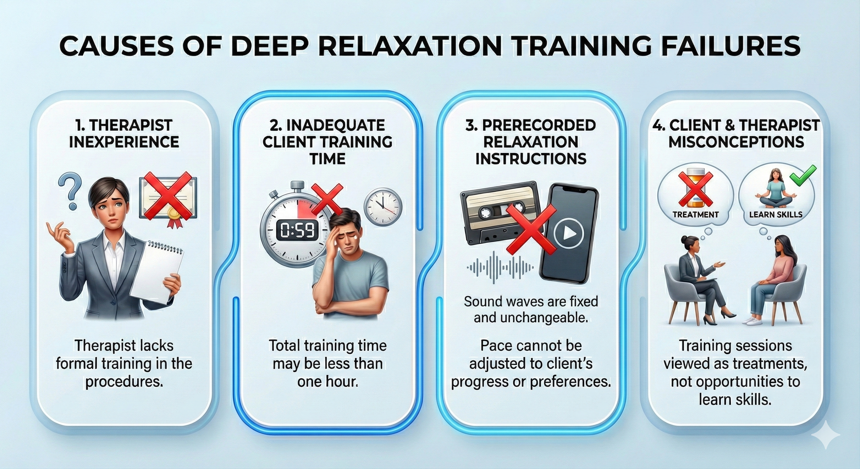 There are three issues with this approach. First, researchers should not be surprised when crippled versions of procedures originally taught over months or years do not produce the profound changes reported by their developers. Second, relaxation training success is greatly influenced by trainer skill and personality (Taub's "person effect"), just like athletic coaching success. Do not blame the tools. Third, recorded instructions have less impact than live instructions and cannot be adjusted to help clients overcome difficulties during a training session.