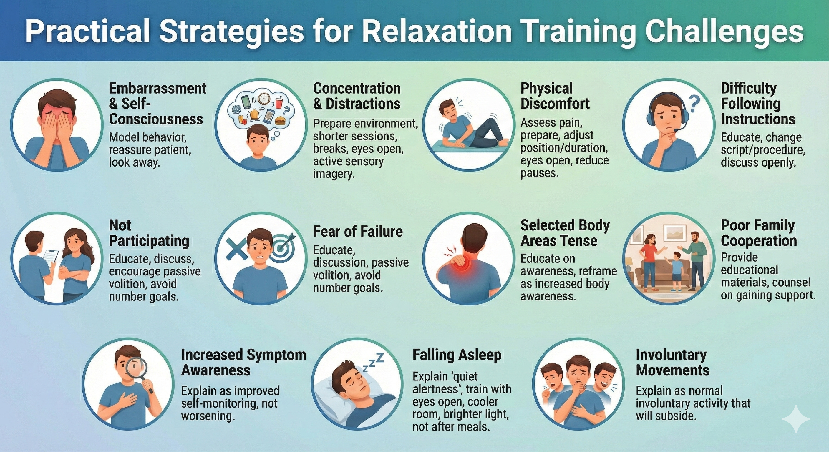 Therapists should remind their clients that relaxation is a state of calm alertness and that you cannot be calm when you force yourself to relax. Instead, therapists should encourage their clients to use passive volition, where they visualize a desired change and then allow their bodies to make the change at their own pace.