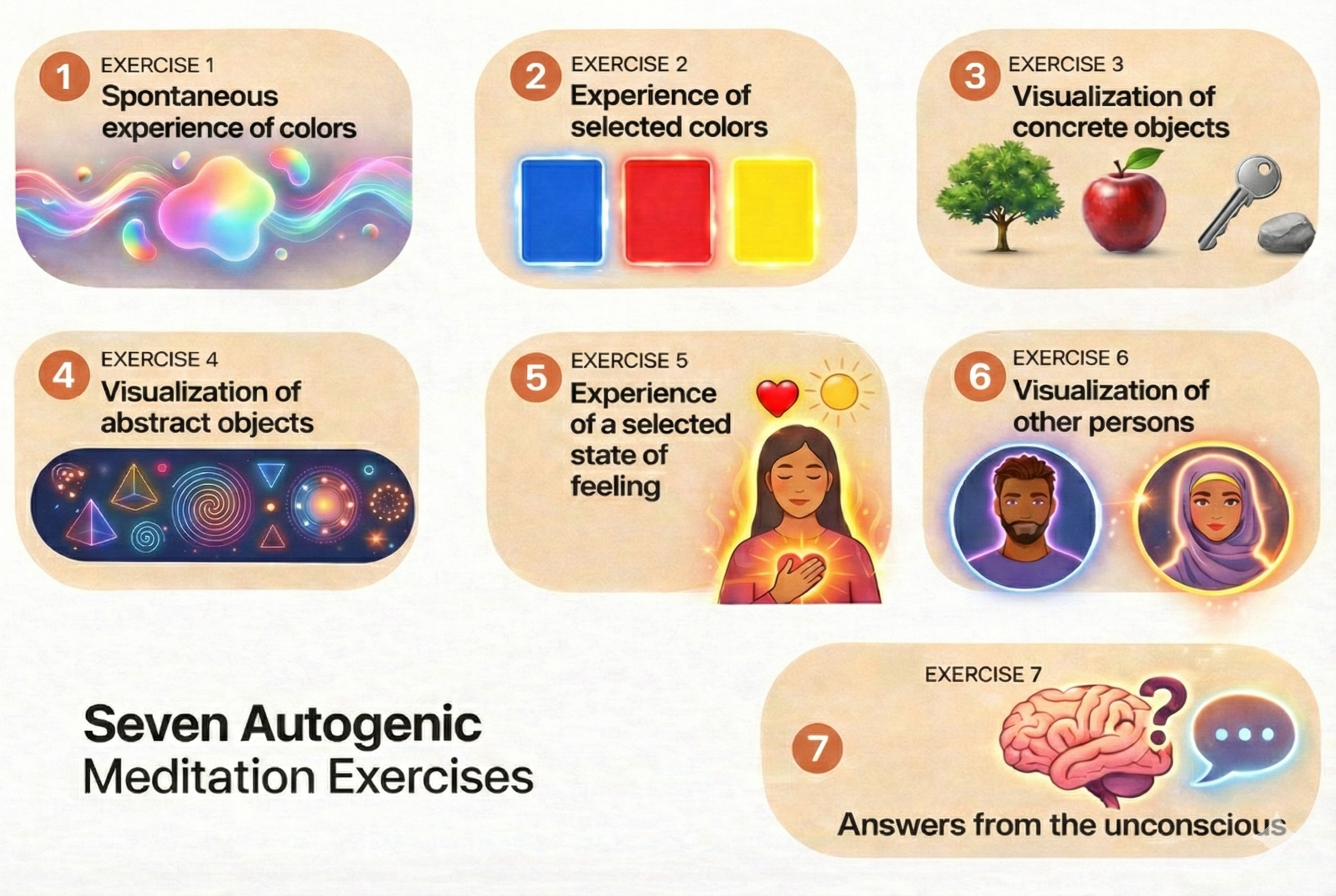 Seven autogenic meditation exercises improve visual imagery skills after a client has mastered the six standard exercises. These exercises are designed to assist clients who find visualization hard. The exercise sequence is arranged in increasing difficulty. The client should follow the established order and only advance after mastering an exercise.