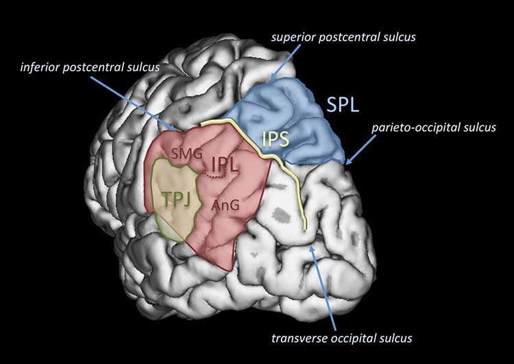temporoparietal junction (TPJ): the intersection of the superior temporal gyrus and inferior parietal lobe that mediates bottom-up shifts in attention in response to stimulus attributes.