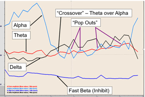 Following significant experimentation and clinical experience, John Anderson and others developed a protocol that involves training the frequency band from 6-9 Hz, which is the actual frequency band of the so-called crossover state. This frequency band straddles the standard 4-8 Hz theta and 8-12 Hz alpha frequency bands. This protocol is combined with an inhibit channel that prevents an increase in 2-6 Hz activity. When allowed to increase during A-T training, it results in what is often known as an abreaction or negative reaction, sometimes involving traumatic recall or depersonalization experiences.