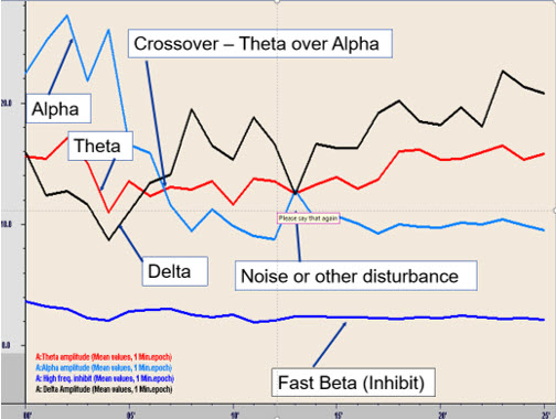 A later session of A-T training initially indicated the increase in alpha as the eyes are closed, followed by a transition to a decreased alpha, increased theta amplitude resulting in a prolonged crossover experience.