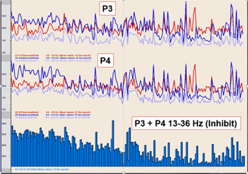 In an early training session with the client using two channels at parietal locations P3 and P4, showing some crossover events but primarily showing a significant decrease in the 13-36 Hz activity that indicates a marked decrease in the initial overactivity of the central nervous system.