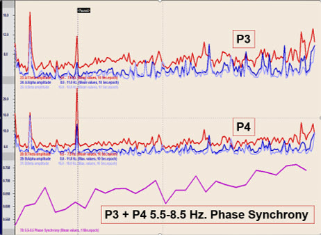 This graphic represents a later session with the same client showing prolonged crossover and an increase in phase synchrony between the two parietal locations in the 5.5-8.5 Hz frequency band used in this case.