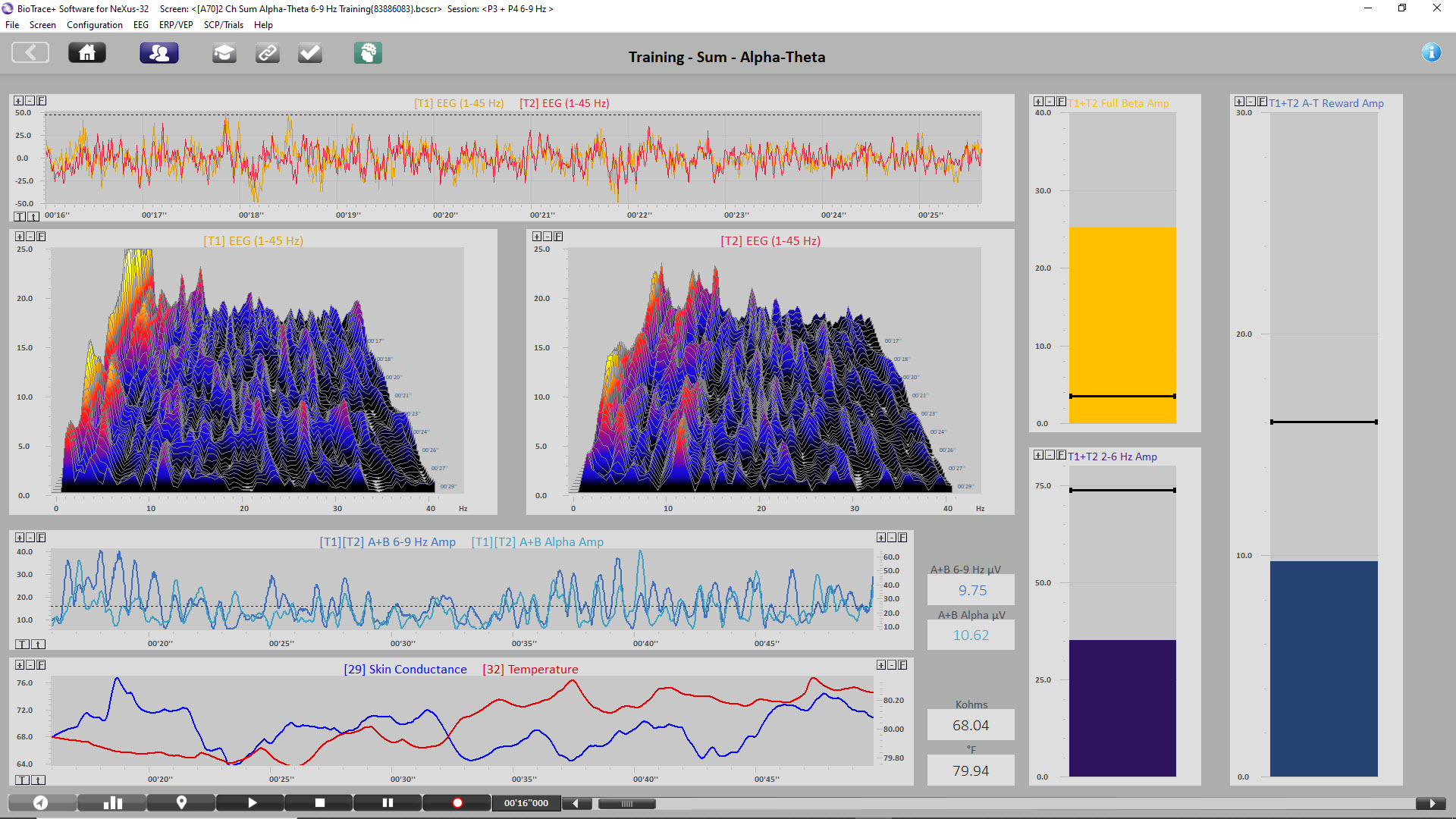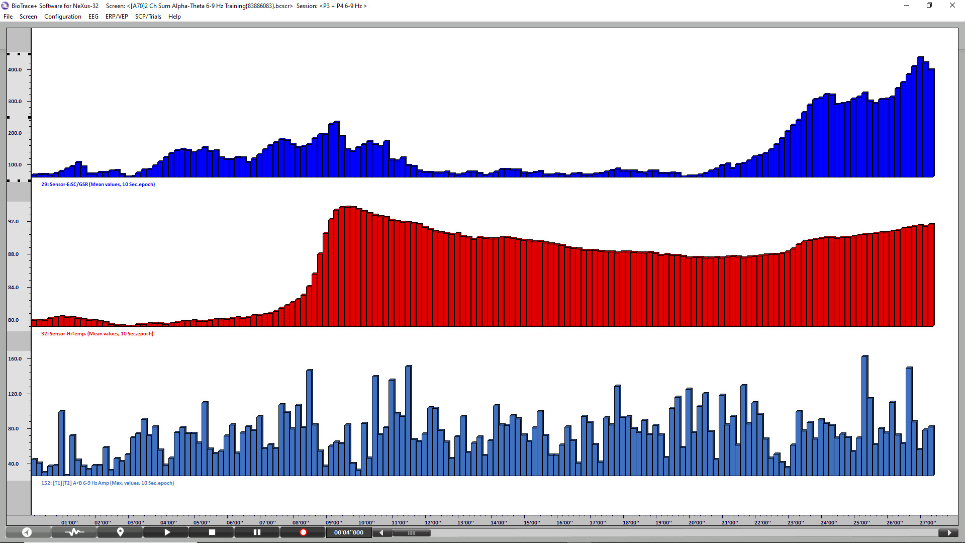 Initial A-T neurofeedback training session showing the initial increase in alpha amplitude followed by a decrease in alpha amplitude to the point where the theta amplitude is greater than the alpha amplitude resulting in brief crossover events.