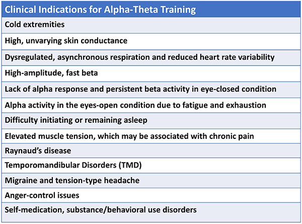 Practitioners have used various pre-training options to facilitate their client’s ability to access the desirable state during A-T training. Peniston (1989, 1990) initially used 10 sessions of hand temperature training to criteria, which was 96°F. Scott and Kaiser (2005) used beta and SMR training to stabilize the nervous system before continuing A-T training. Other practitioners use heart rate variability training and/or a combination of training approaches depending on the client’s needs. Some optimal performance practitioners begin directly with A-T training, which may be their sole neurofeedback intervention.