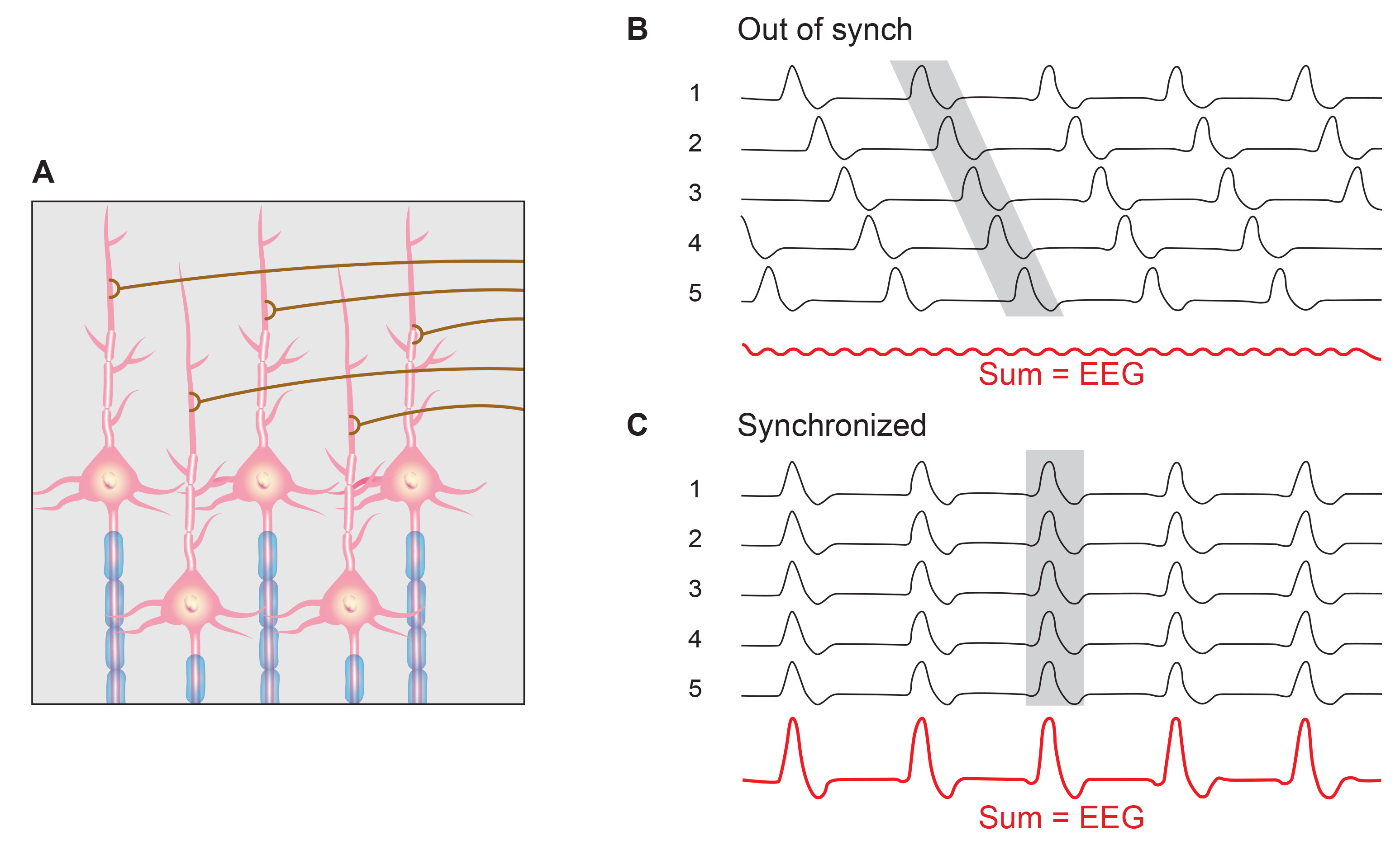 LFP and subsequent EEG activities are generated by the sum of postsynaptic potentials from the synchronized excitation of neurons, reflecting input into the neurons. Greater firing synchrony produces larger potentials on the scalp surface. Graphic redrawn by minaanandag on fiverr.com.