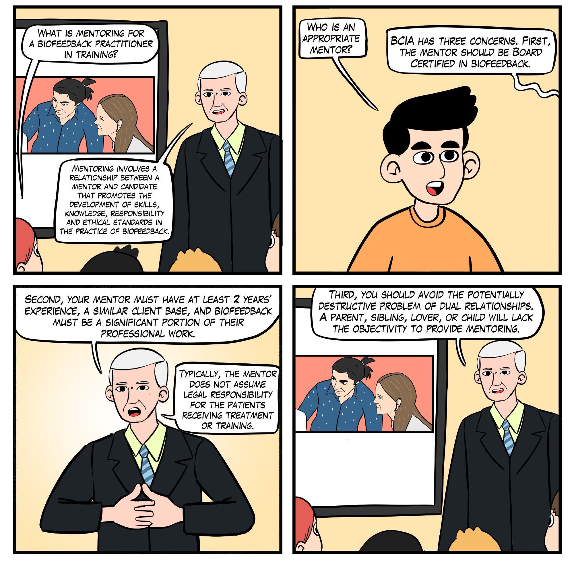 Mentoring is the 'process of transmitting knowledge and skills from the trained to the untrained or the experienced to the inexperienced practitioner. Mentoring involves a relationship between a mentor and candidate that promotes the development of skill, knowledge, responsibility, and ethical standards in the practice of biofeedback' (bcia.org).