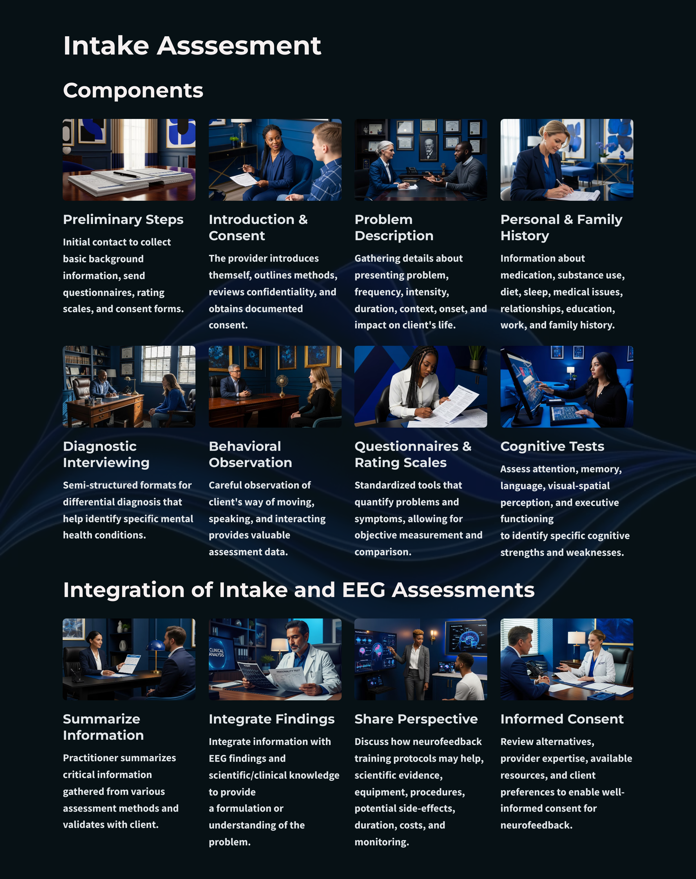 The practitioner uses various methods during the intake assessment and organizes the resulting information into a summary that has utility for describing and understanding the client’s problems and goals and planning subsequent steps, including neurofeedback training. Data collected with various methods help the client make a confident and well-informed decision about whether to proceed with neurofeedback training.