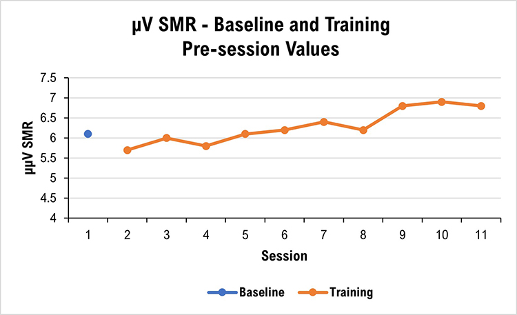 The EEG variable targeted for training is usually measured during a pre-training baseline for each session. The saved data can be artifacted. The value of the EEG variable can then be graphed from session to session, with the value from the intake assessment being used as a baseline for these within-training session baselines (see Figure 1).