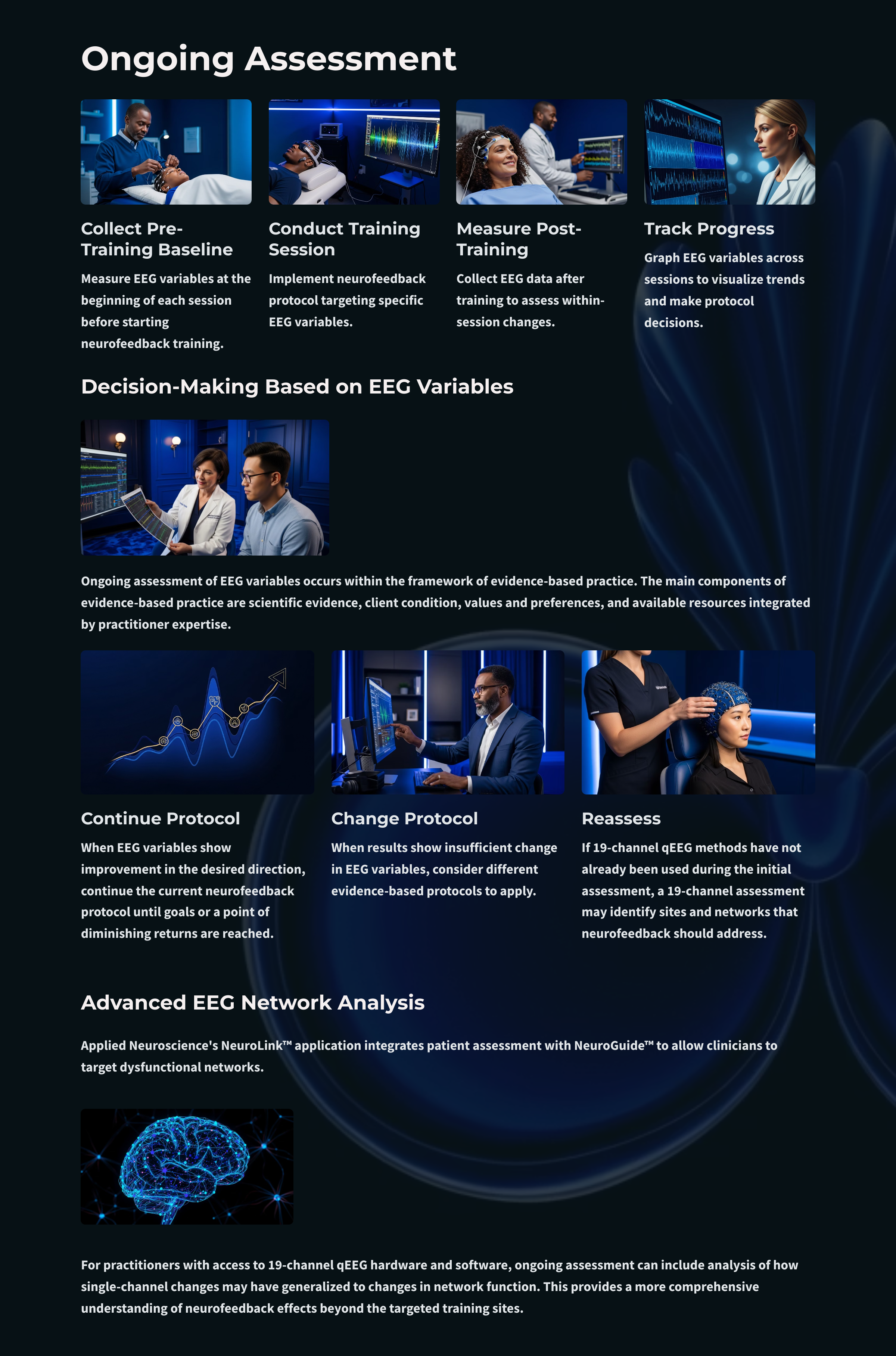 Additionally, ongoing assessment supports maintaining a positive working relationship by allowing the client and practitioner to examine outcomes and make evidence-based decisions collaboratively. Seeing progress through continuous assessment also motivates the client to persevere with training and apply skills that build on neurofeedback effects outside of the training session.