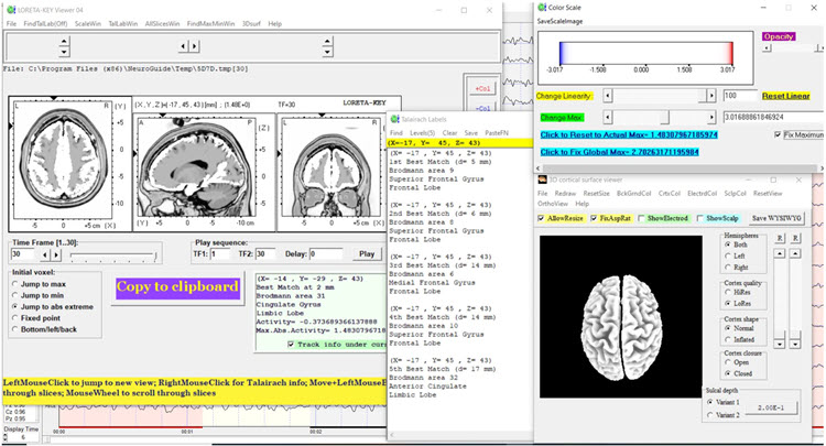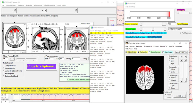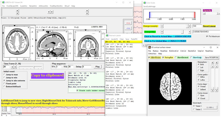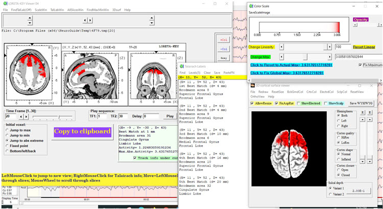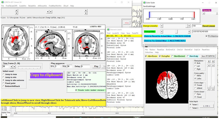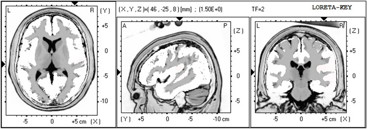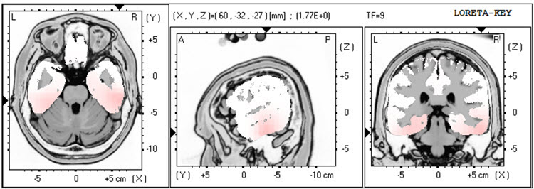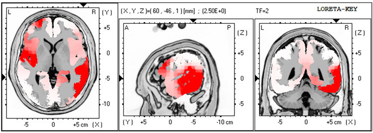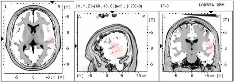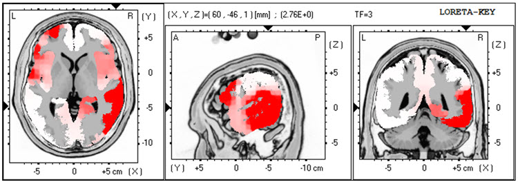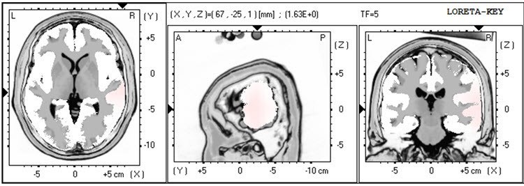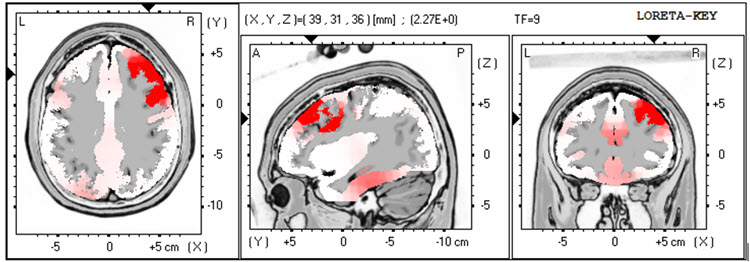 The LORETA analysis shows broadly distributed 1-Hz activity which is expected due to the ECG artifact, and also shows the lateralized left frontal and right posterior temporal/parietal areas as exceeding 2 standard deviations at 2-6 Hz, as well as right lateral frontal 9 Hz activity exceeding 2 standard deviations (see LORETA images below).
