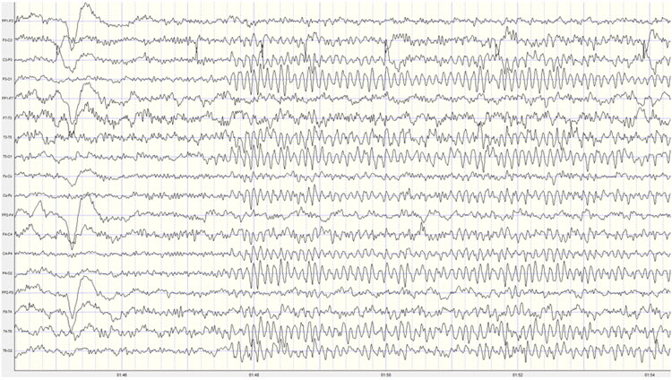 Longitudinal Bipolar Montage – this is a good quality recording with moderate eye movement artifact and only intermittent movement and EMG artifact. There are no discernable mains or equipment artifacts.