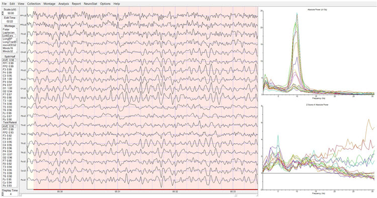 The linked ears montage shows broadly distributed alpha activity suggesting reference contamination. The highest voltage of the posterior rhythm is in the occipital electrodes. There is alpha activity in the reference electrodes and a pronounced ECG artifact that will likely produce excess 1 Hz statistical values in the z-score analysis. This should be disregarded.